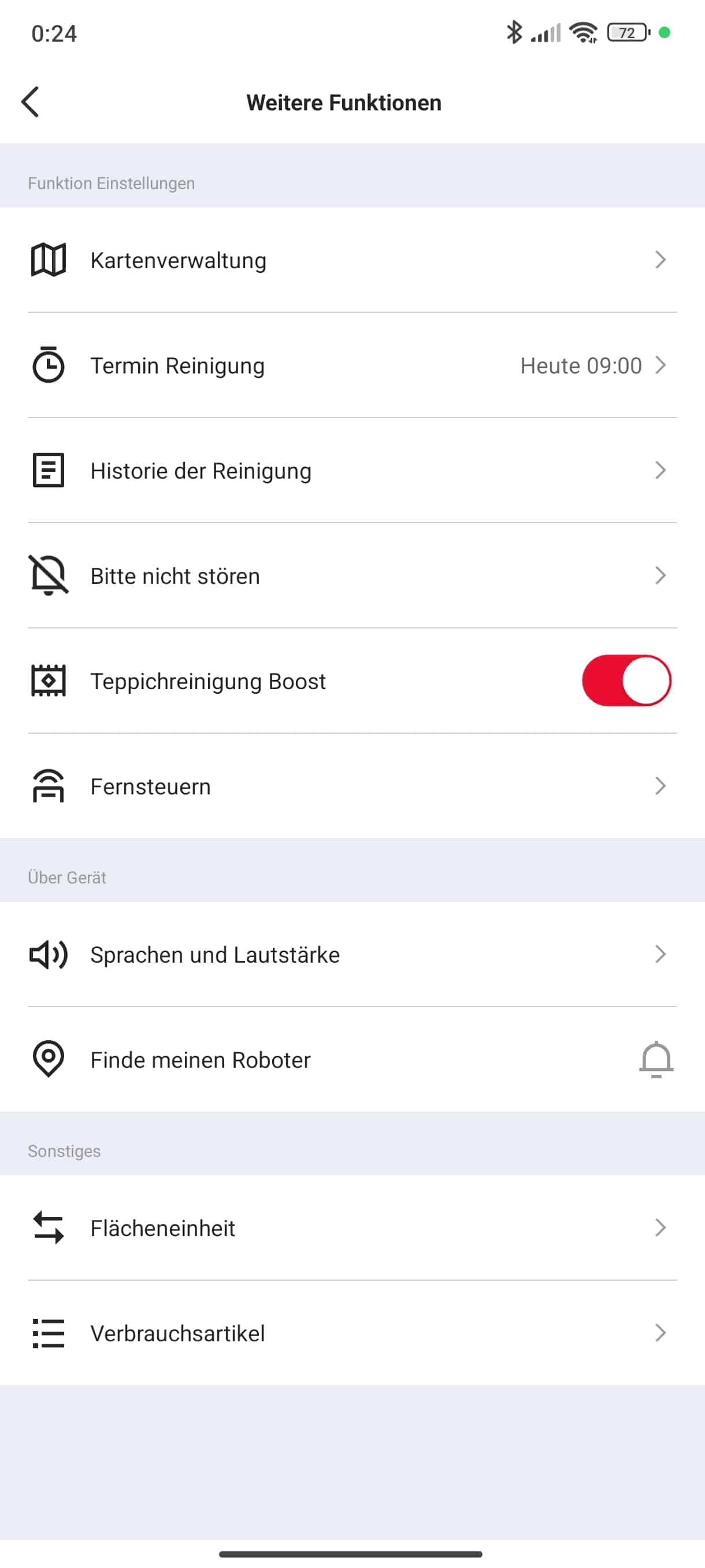 Weitere Funktionen sind unter anderem die Fernsteuerung des Saugroboters, die Einsicht in die Reinigungshistorie oder die Planung fester Termine für die automatische Reinigung. Dies ist tageweise möglich und auch hier kann gewählt werden, ob die gesamte Karte oder z.B. nur bestimmte Räume genutzt werden sollen. Darüber hinaus ist eine Integration mit Amazon Alexa, Google Home oder Apple Siri Shortcuts verfügbar.