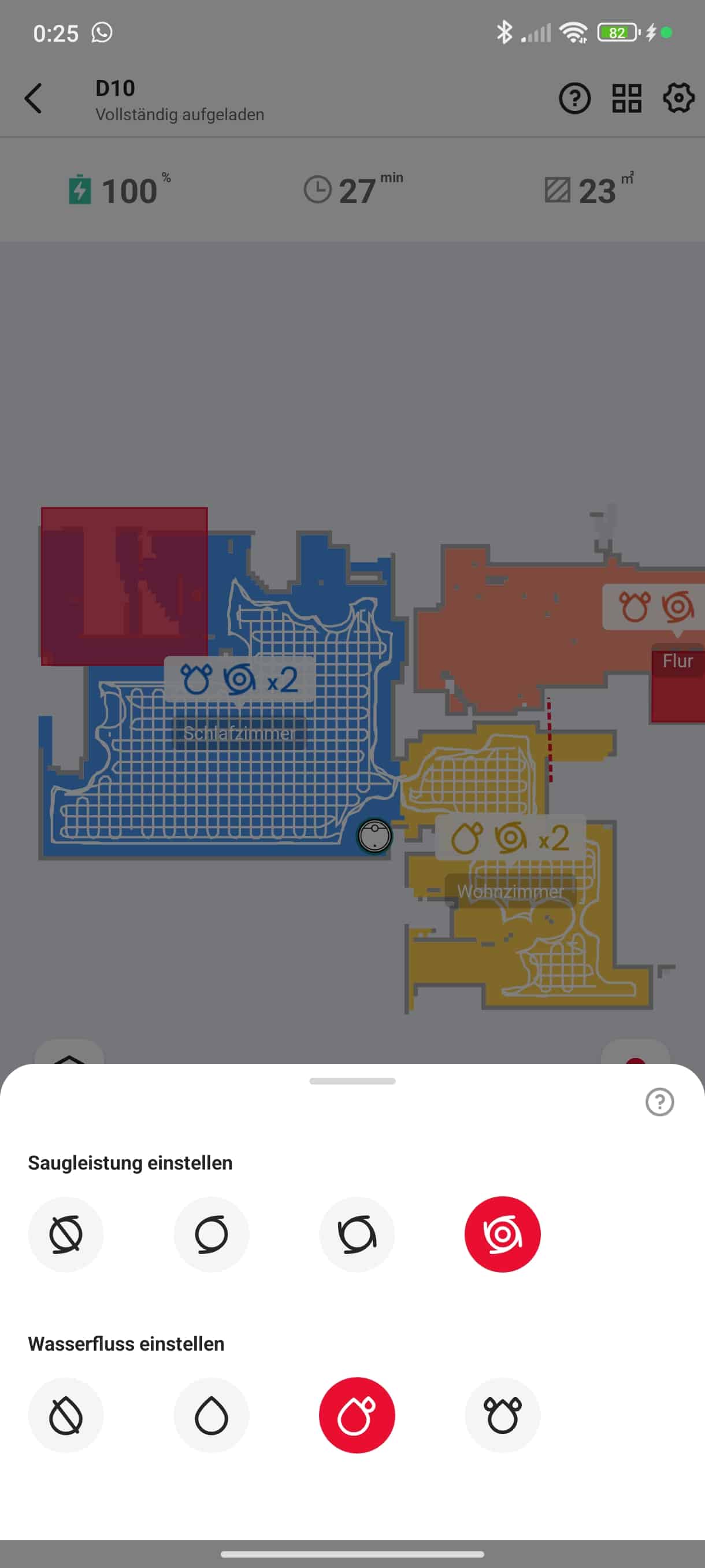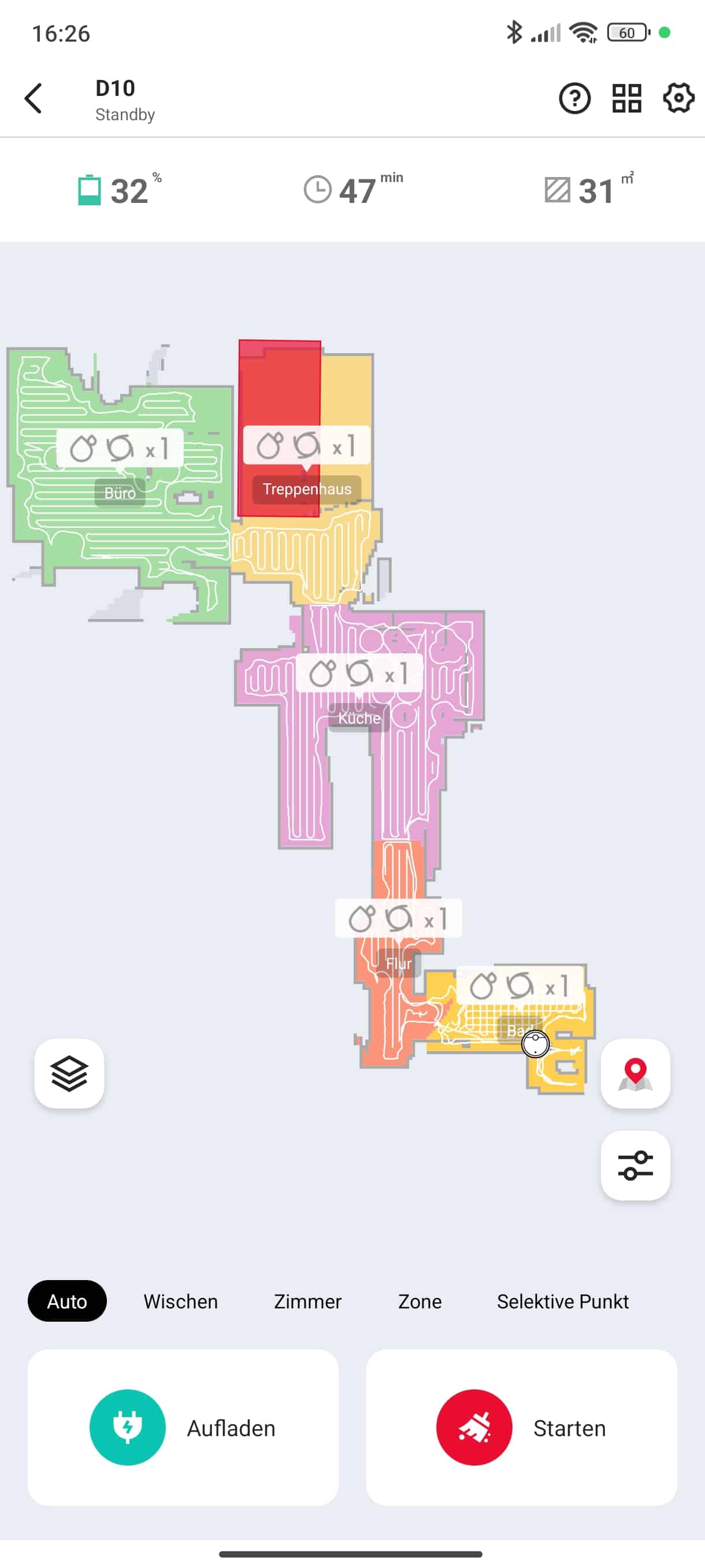 Was den Funktionsumfang der App betrifft, so wird bei Auswahl des D10 die aktuelle Karte angezeigt sowie der letzte Saugvorgang visuell dargestellt. Diese Karte wird automatisch über den LiDAR-Sensor generiert, was bei der ersten Inbetriebnahme ca. 10 Minuten dauern kann. Maximal können bis zu fünf Karten in der Anwendung gespeichert werden. Weiterhin werden die gescannten Flächen automatisch unterteilt, lassen sich bei Bedarf aber auch manuell anpassen. Zusätzlich können Sperrzonen zugewiesen werden, die der Ultenic D10 souverän umfährt. Auch die Saugleistung bzw. der Wasserdurchfluss lässt sich in vier Stufen einstellen, dies funktioniert sogar raumspezifisch. Außerdem kann man in der Übersicht wählen, ob man einen bestimmten Raum oder eine bestimmte Zone gerade reinigen möchte. Sollte einmal ein Missgeschick passieren, kann man diesen Punkt gezielt auf der Karte markieren und der Ultenic D10 säubert umgehend den Bereich.