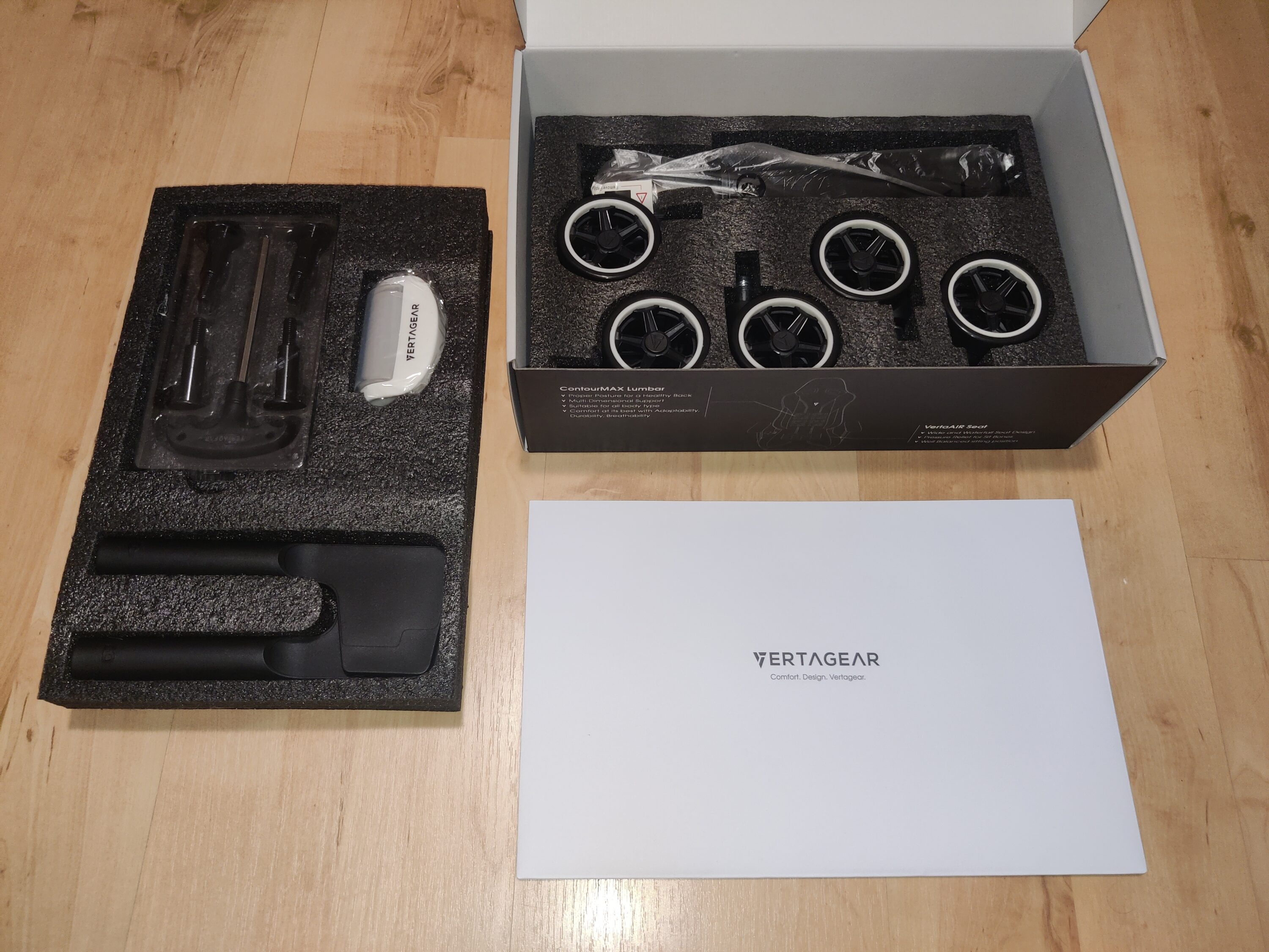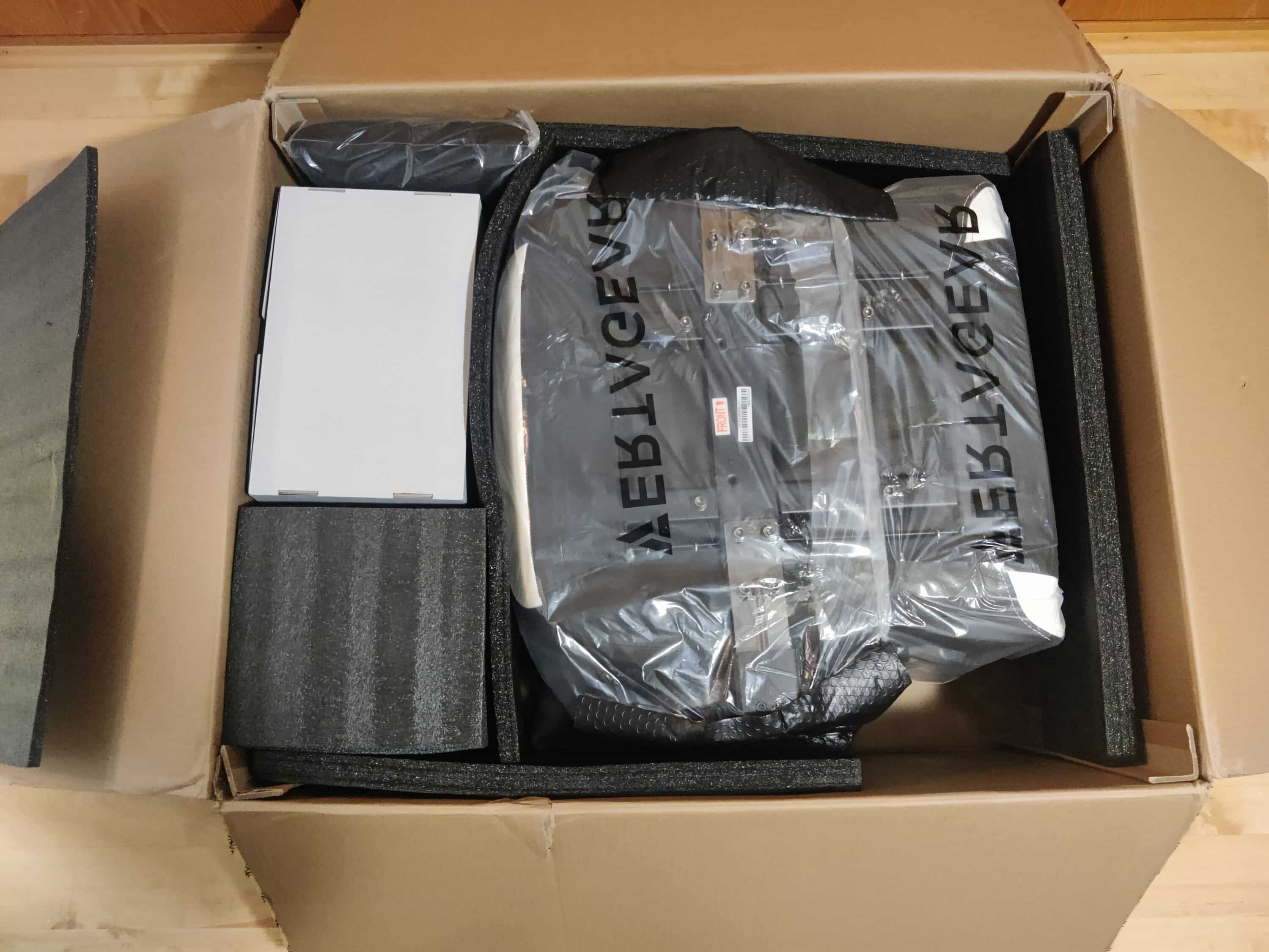 Der Vertagear PL4800 kommt in einem großen Karton daher. Beim Öffnen des Kartons fällt zunächst auf, dass sich an jeder Seite viel Schaumstoff und Luftpolsterfolie befindet, um Beschädigungen bei der Auslieferung zu vermeiden. Sämtliches Zubehör ist separat in einer eigenen Schachtel verpackt, während sich die Rückenlehne, die fünfgliedrige Fußbasis, der Sitzmechanismus und die Sitzfläche den restlichen Platz im Karton teilen.
