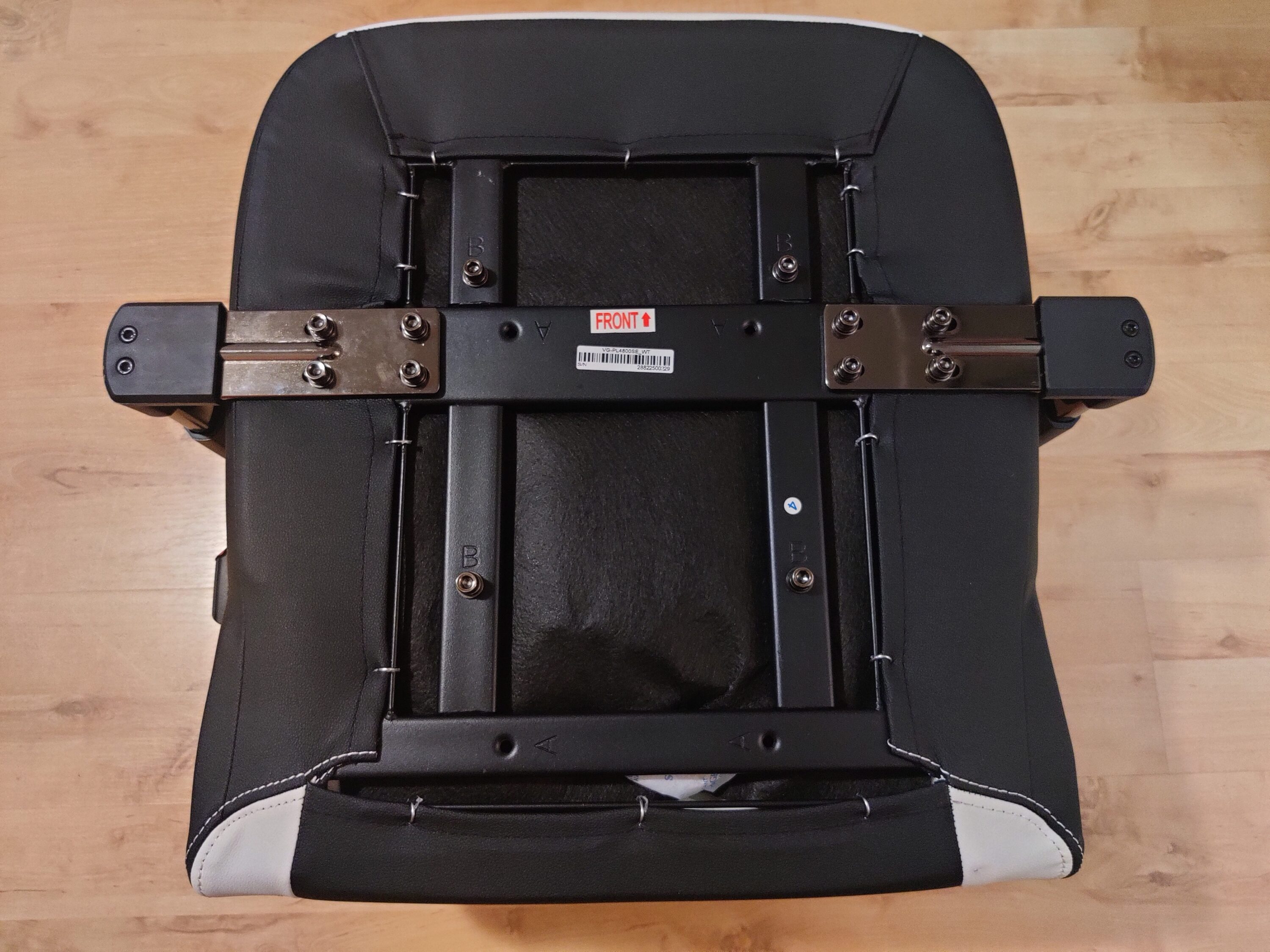 Nun ist die Unterseite des Vertagear PL4800 schon vollständig montiert und kann mit der Fußbasis zum Boden hin umgedreht werden. Zum Anbringen der Rückenlehne werden lediglich die beiden Halterungen an der Sitzfläche aufrecht gemacht, die Rückenlehne darübergestülpt und mittels zwei M8-Schrauben an jeder Seite montiert. Optional kann nun auch das Kopfkissen an der Rückenlehne angebracht werden.