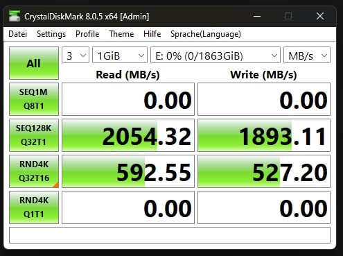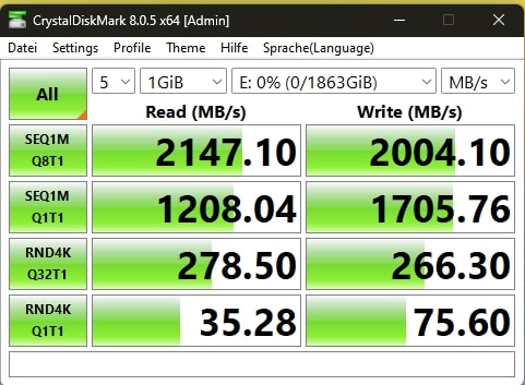 Ähnlich sieht es im AS SSD Benchmark aus. Hier erreiche ich 1.948,05 MB/s lesend und 1.879,70 MB/s schreibend.