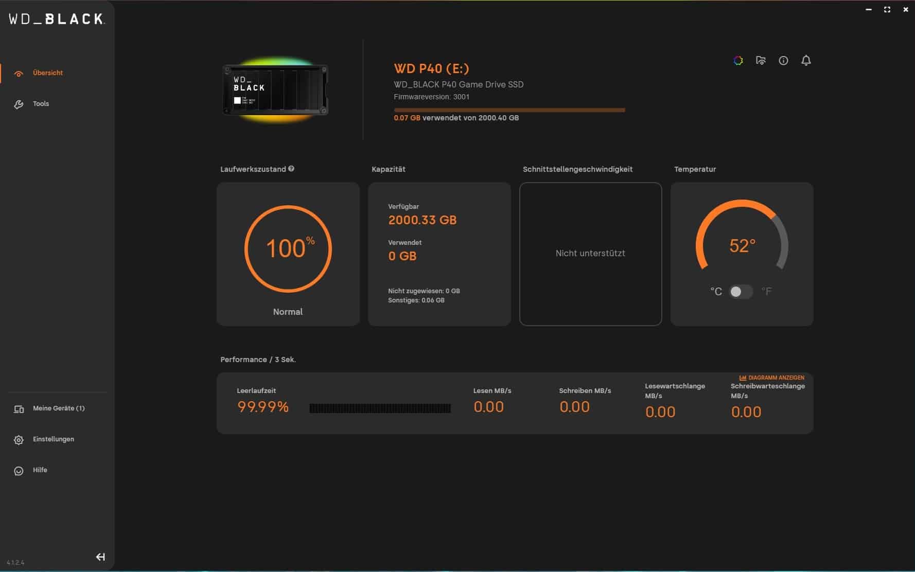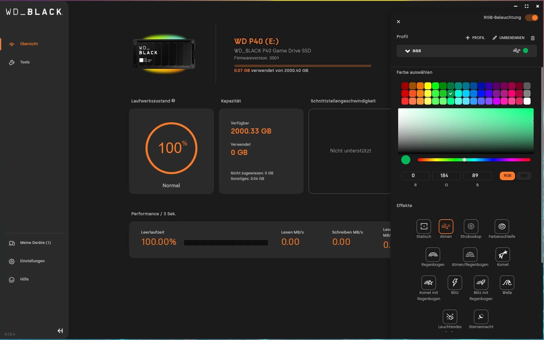 Als optionale Begleit-Software kann die externe SSD mit dem WD_Black Dashboard gekoppelt werden, das allerdings leider nur für Windows angeboten wird. Die App informiert beispielsweise über Zustand und Temperatur der Speicherlösung, die aktuelle Performance und lässt dich die RGB-Beleuchtung in den unterschiedlichsten Farben und Effekten anpassen.
