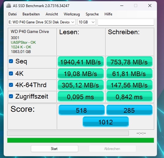Vor allem bei der 4K-64Thrd-Leistung und den Zugriffszeiten punktet das WD Black P40 Game Drive, allerdings offenbaren sich leichte Schwächen beim 4K-Lesen, bei dem die externe SSD hinter Samsungs T9 zurückfällt. Dennoch springen am Ende 1.827 Punkte als starkes Gesamtergebnis heraus. Ein Top-Wert.