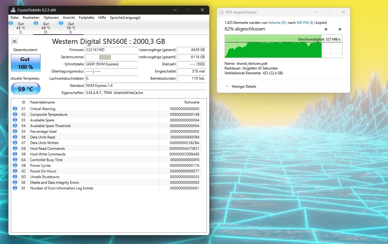 Unter der Alu-Haube verbaut der Hersteller übrigens die NVMe-SSD SN560E mit PCIe 3.0 x4-Anbindung und TLC-NAND, die allerdings ohne DRAM daherkommt. Der erklärt auch den günstigeren Preis im Vergleich zum (teureren und größeren) WD Black P50 Game Drive, das die SN750E mit DRAM verbaut hat.