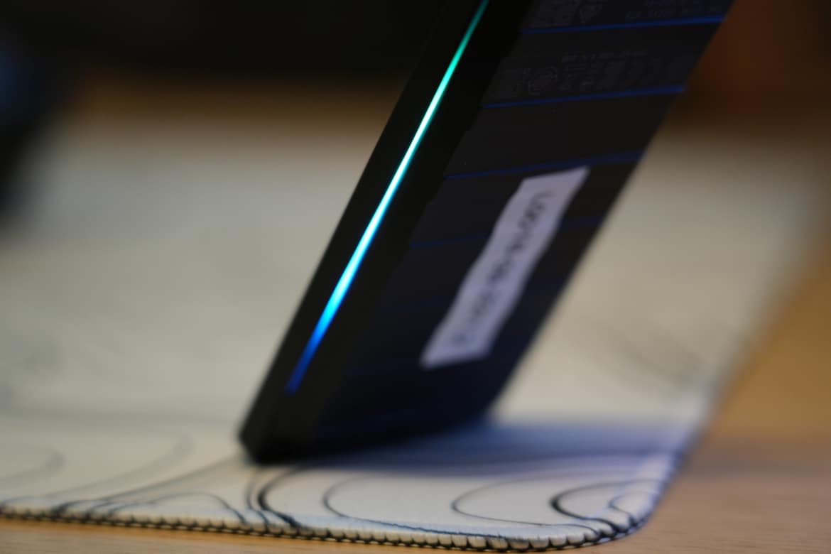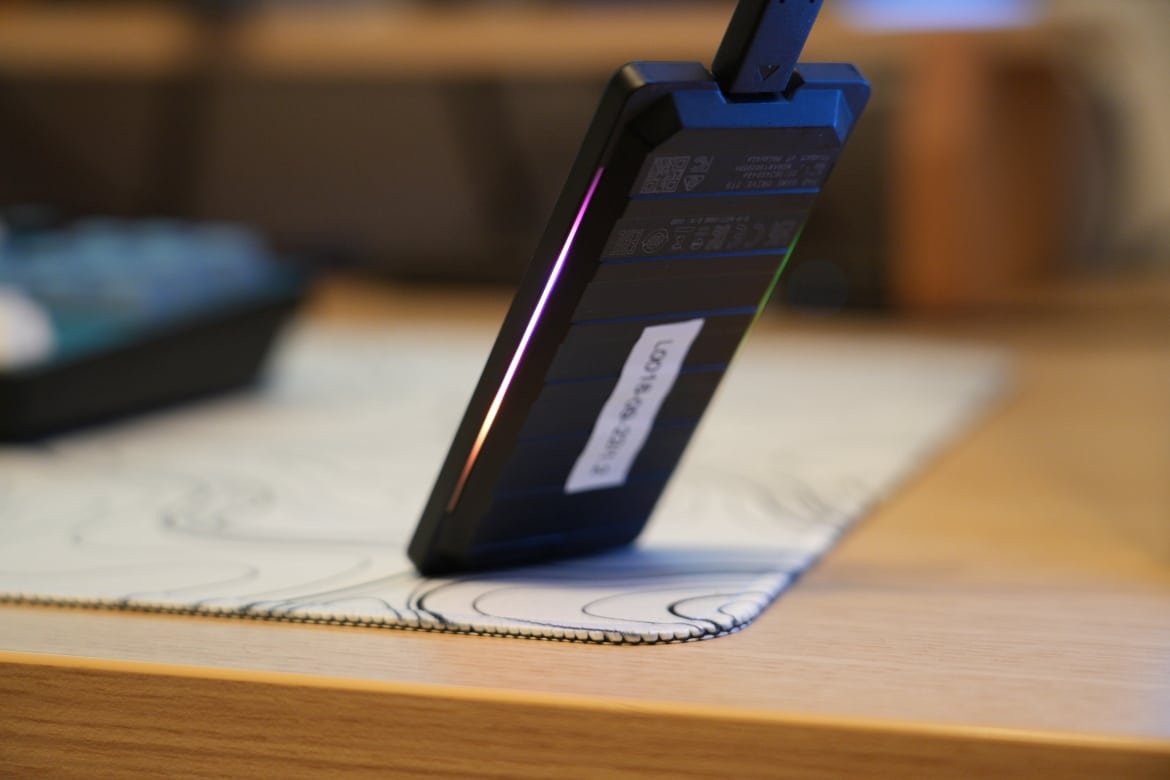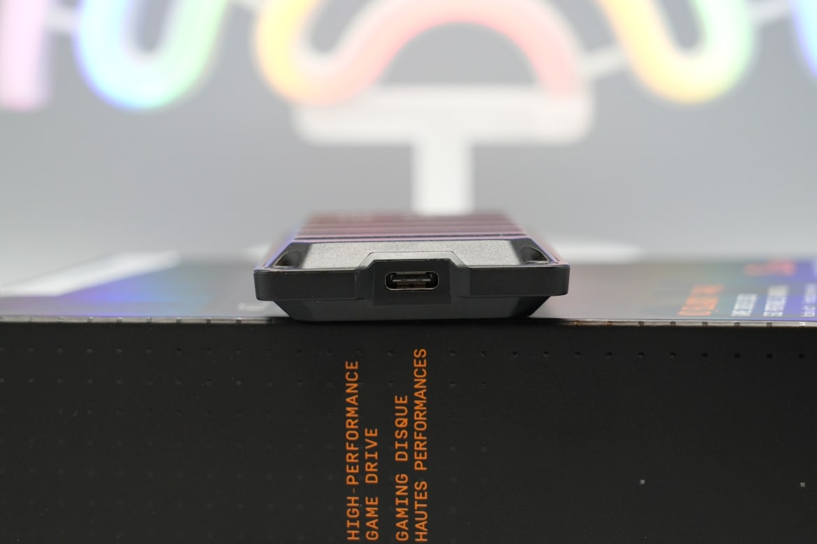 Der einzige Anschluss in Form eines USB 3.2 Gen 2 x2-Type-C-Ports findet sich, leicht eingelassen, an der rechten Seite des Gehäuses. Eine Besonderheit gibt es hingegen an der Unterseite, denn hier finden sich – links und rechts unter dem Rahmen – LED-RGB-Leuchtstreifen, die in kunterbunten Farben erstrahlen und in Kombination mit der Begleit-App auch angepasst werden können.