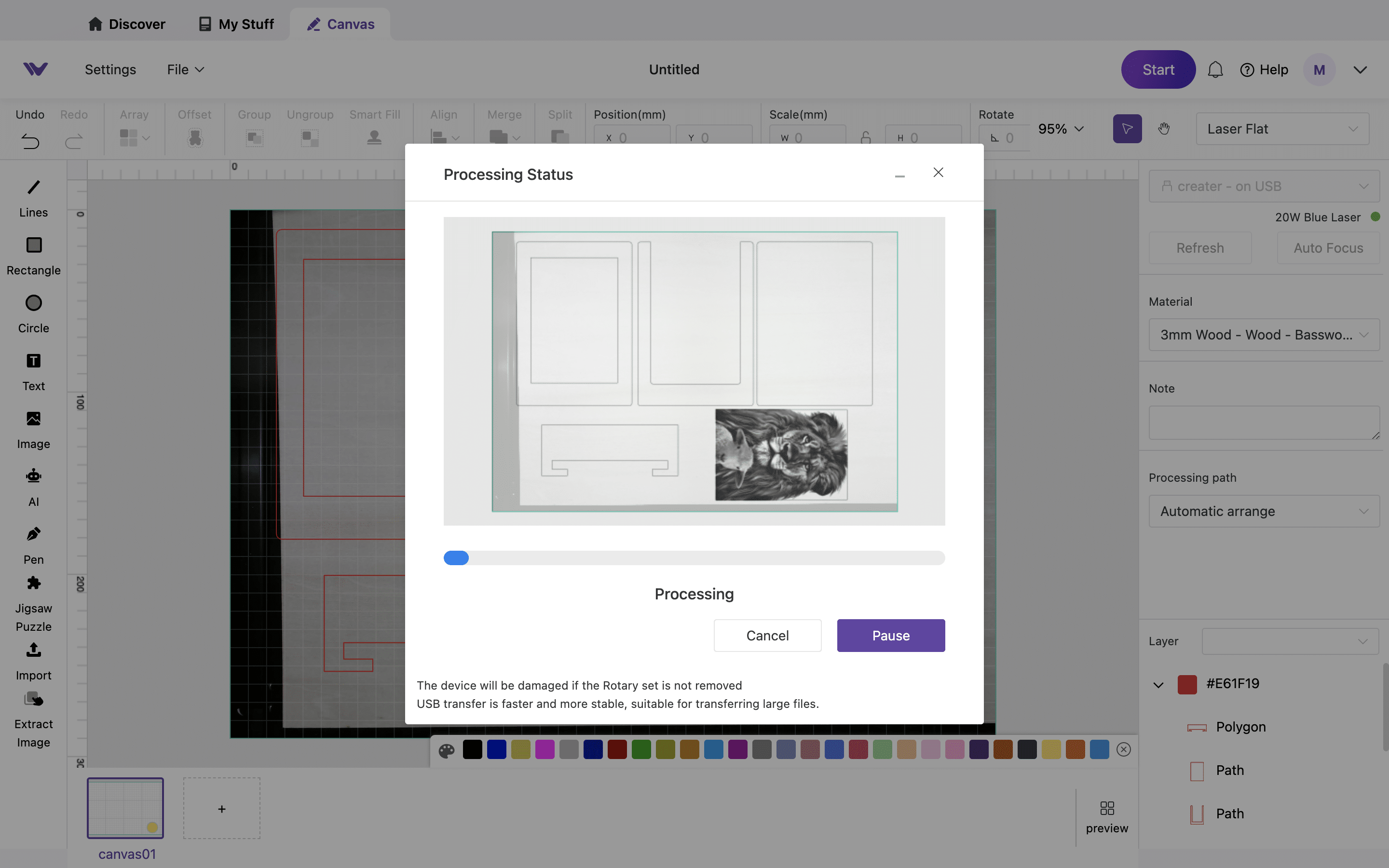 In der Vorschau der Software habe ich die Leistung und Geschwindigkeit wieder nicht manuell eingegeben. Stattdessen wählte ich einfach Holz mit einer Dicke von 3 mm als Material aus. Zum Ergebnis kam ich blitzschnell. Nachdem ich das Projekt startete, legte der Laser direkt los und schnitt extrem saubere Linien ins Holz.