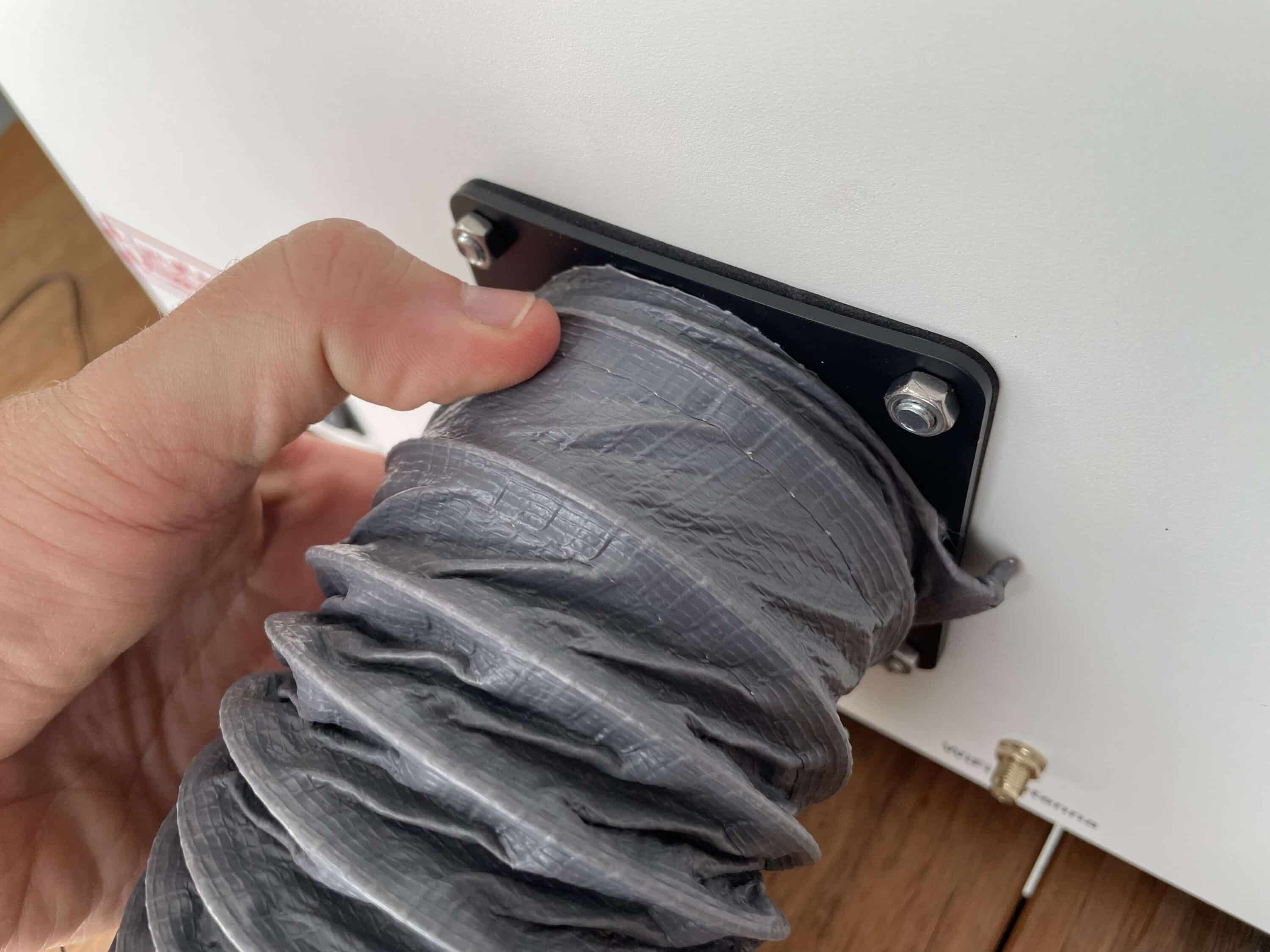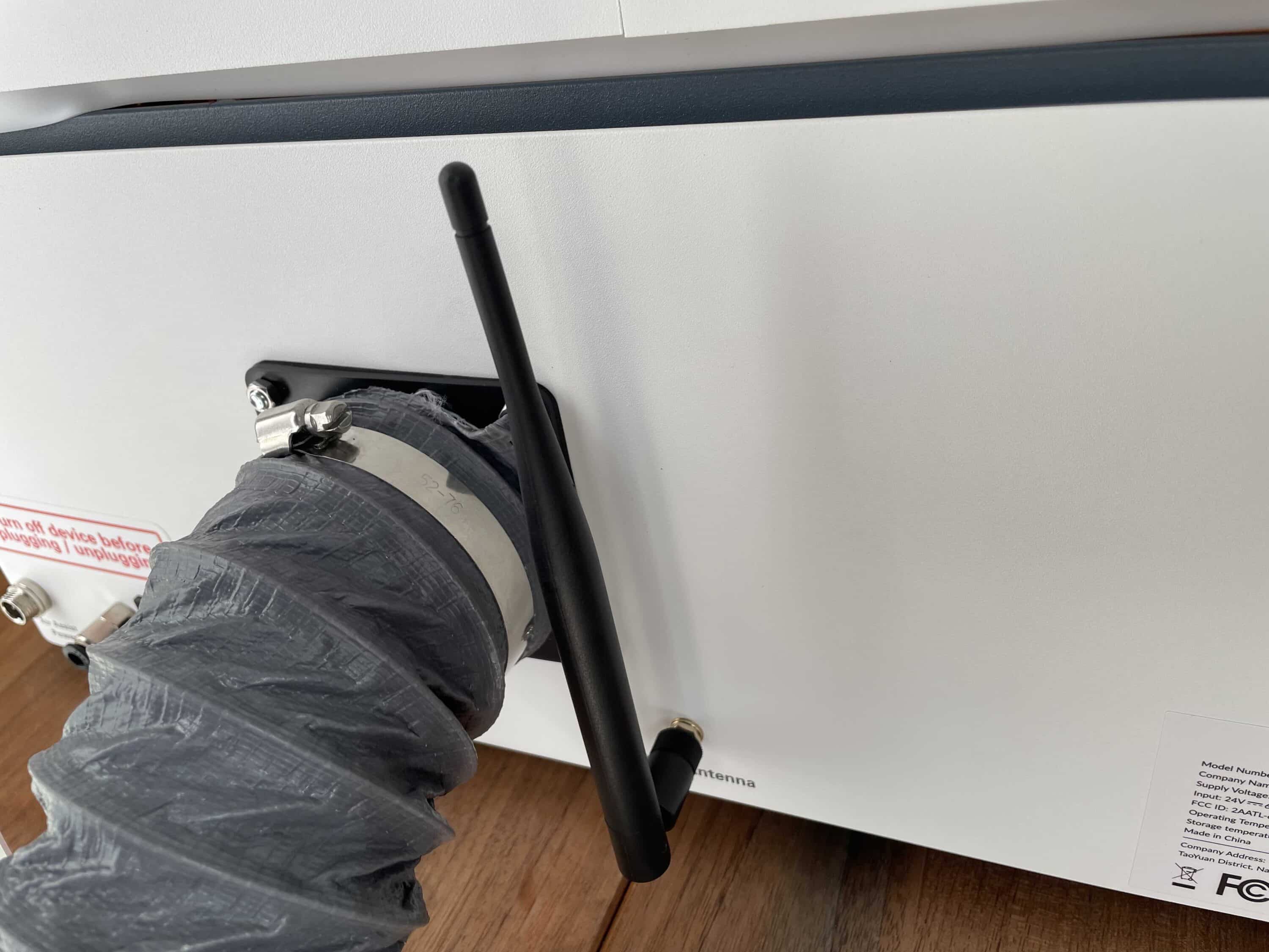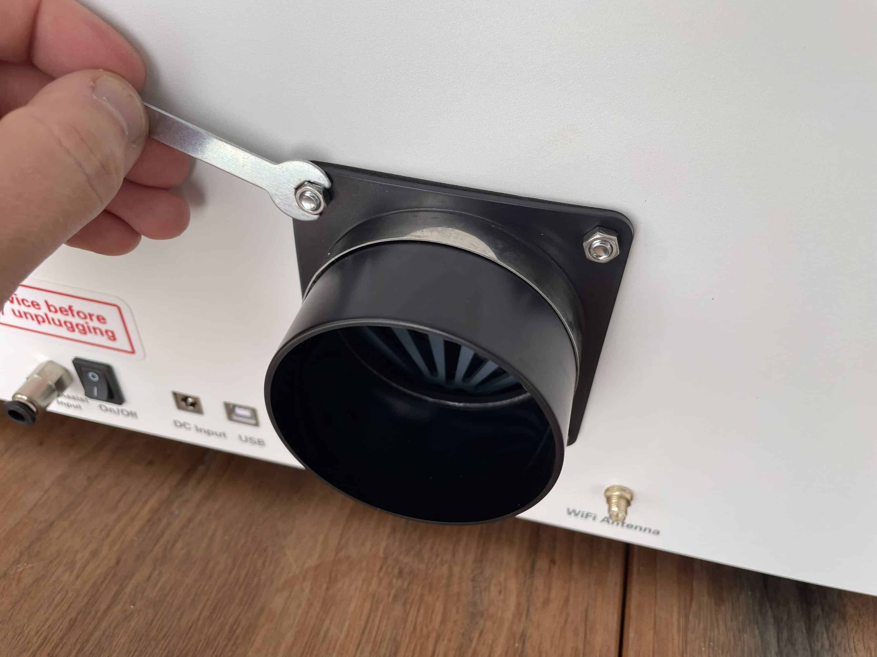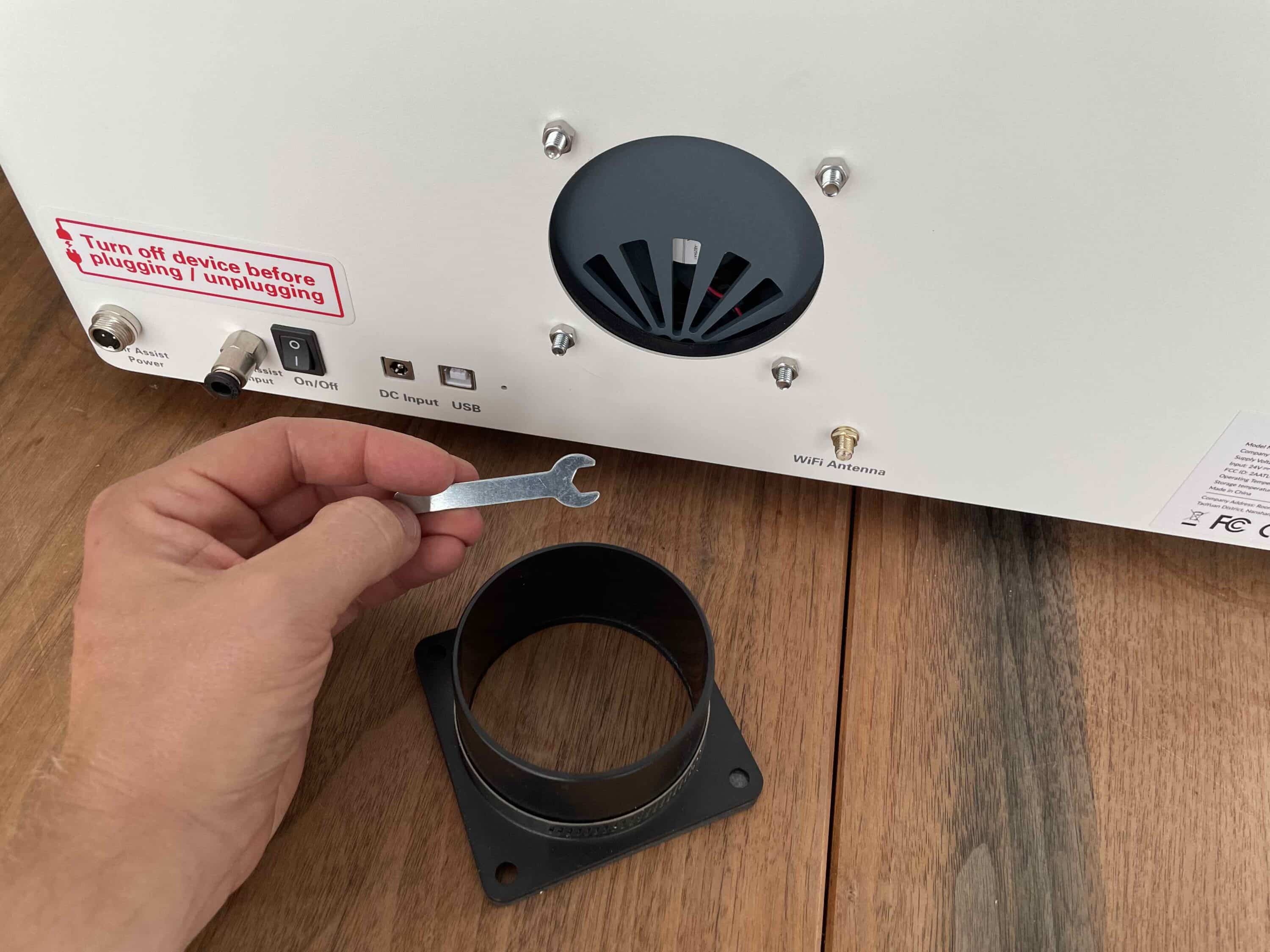 Beim WeCreat Vision muss man lediglich das Lüftungssystem, die WiFi-Antenne und den Schlauch für die Abluft befestigen. Die entsprechenden Anschlüsse sitzen an der Rückseite des Gerätes.