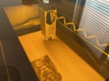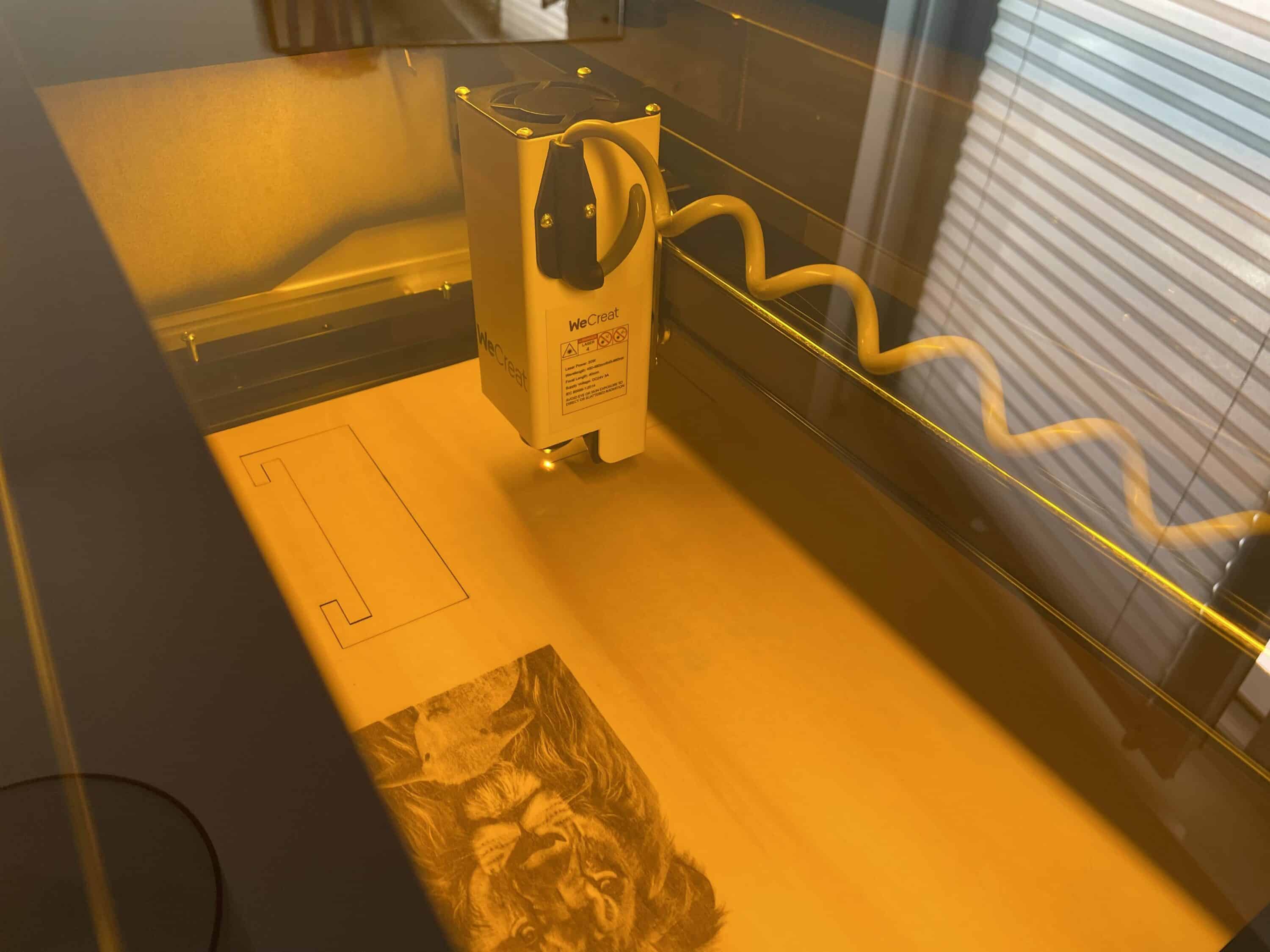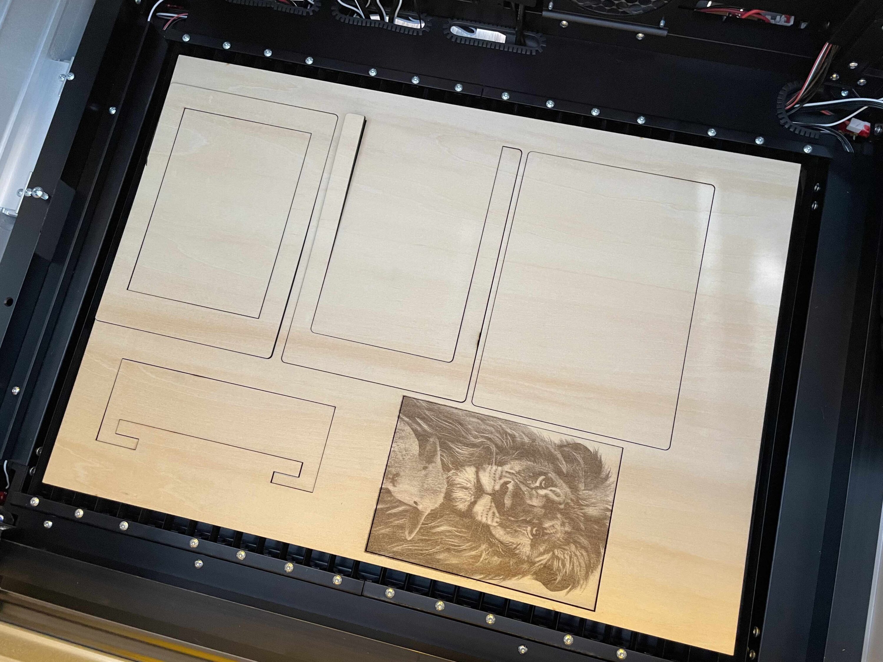 Das Tolle an dem Projekt: Wir können bei nur einem Projekt die Performance beim Gravieren, aber eben auch dem Schneiden unter die Lupe nehmen. Nachdem ich in der Software alles einstellte, ging es direkt los. Die Maschine begann zunächst damit, das Bild auf das Holzpaneel zu gravieren. Im Anschluss begann es den Schneidevorgang.