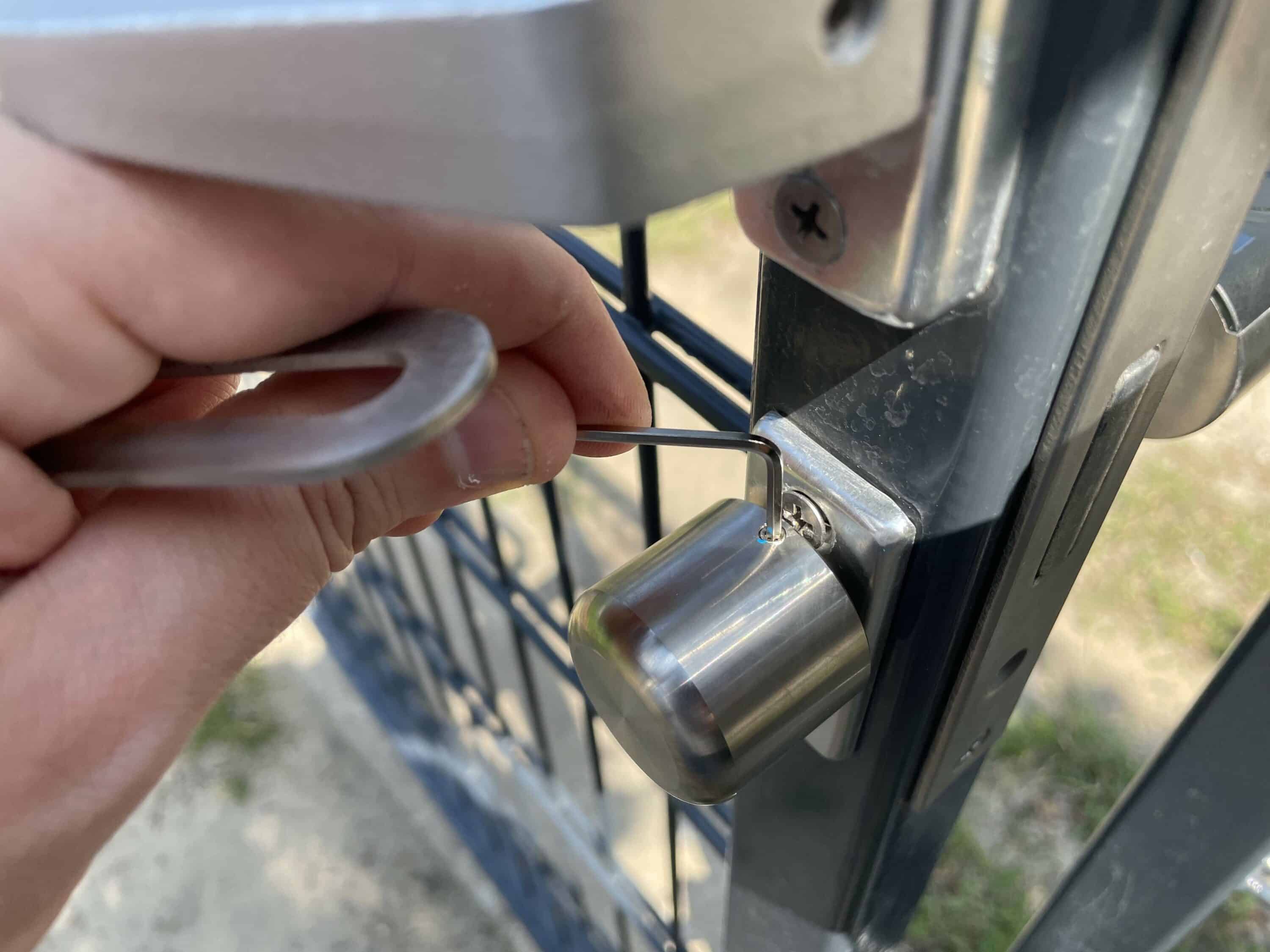 Dieser macht einen wunderbar robusten Eindruck und scheint aus hochwertigem Edelstahl gefertigt zu sein. Am vorderen und hinteren Ende befindet sich jeweils ein Knauf. Der kleinere der beiden ist für den Innenbereich gedacht. Mit dessen Hilfe lässt sich die Tür schließen. Dementsprechend befindet sich der größere Knauf an der Tür-Außenseite.