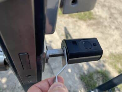 Natürlich ist auch ein Entsperren mit dem Smartphone möglich. Hierfür muss man einfach nur bei vorhandener Bluetooth-Verbindung in der App das Schloss-Symbol drücken. Zu guter Letzt ermöglicht WeLock auch die Verwendung eines USB-Security-Keys. Dieser lässt sich über den USB-C-Port unter der Gummiklappe der Außeneinheit einstecken. Anschließend gibt das Schloss den Weg frei.