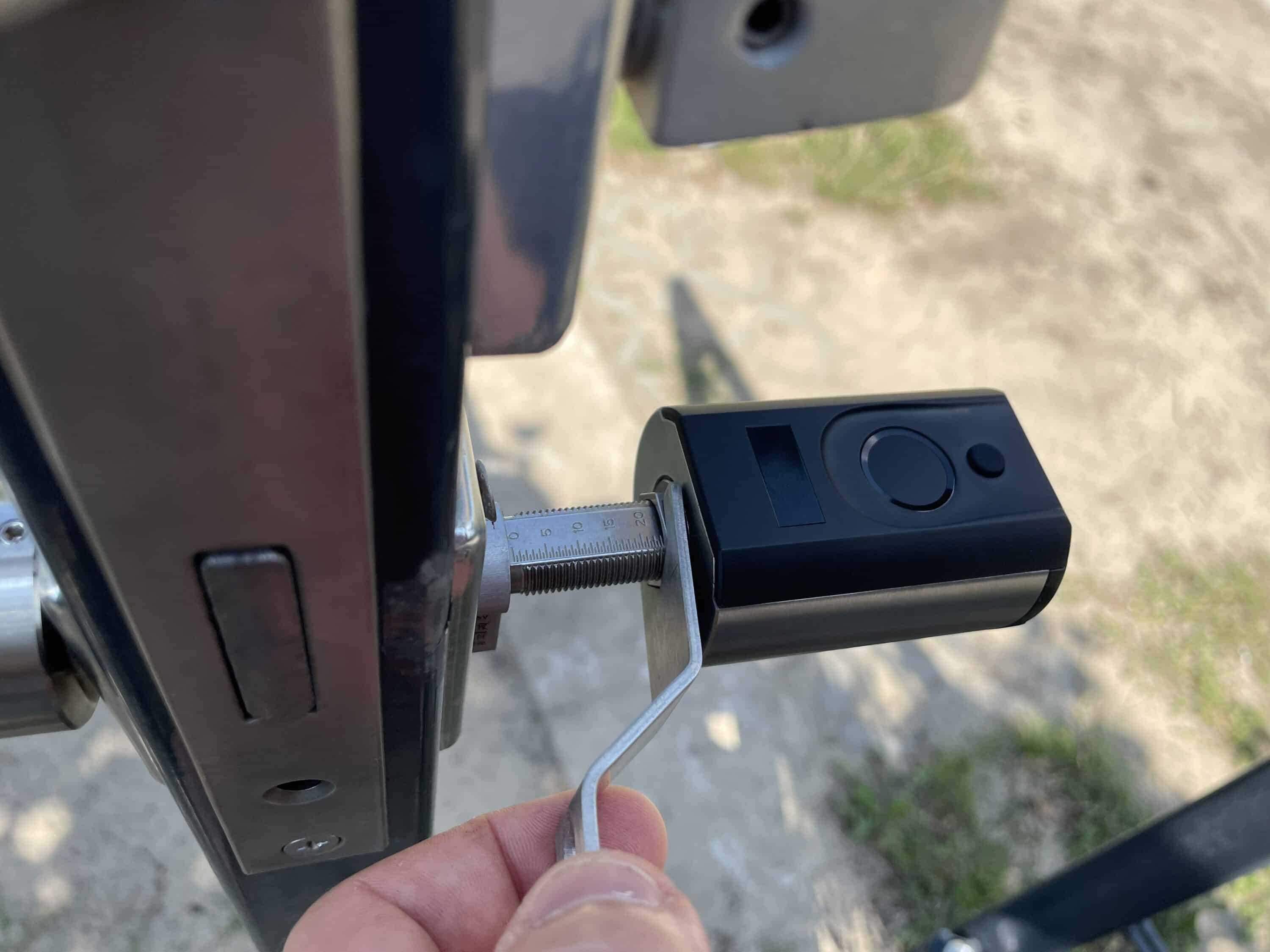 Je nach Türdicke muss man dabei Anpassungen vornehmen, indem die die Knäufe mehr oder weniger weit raufgeschraubt werden. Nun schaltet man das Schloss über den Power-Button ein und registriert den Administrator-Fingerabdruck.