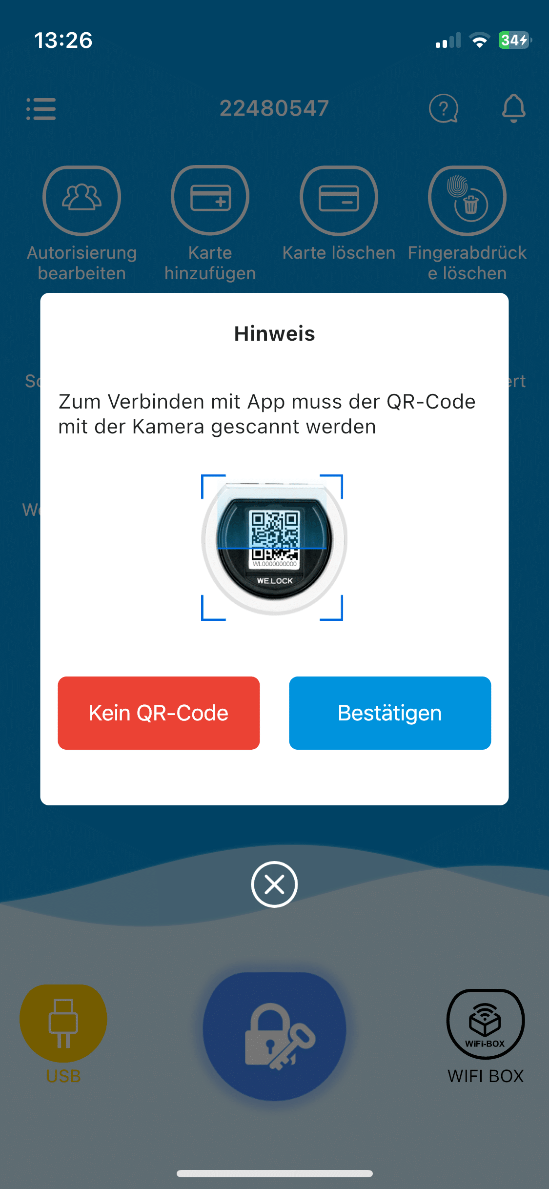 Weiter geht es in der WeLock App. Nachdem man sich ein Nutzerkonto eingerichtet hat, fügt man das frisch installierte Schloss einfach hinzu. Hier wird der QR-Code an der Gummiklappe des Schlosses gescannt und anschließend die ID des Zylinders eingetippt. Nun wird das Schloss nach anschließender Bestätigung mit dem Fingerabdruck mit der App gekoppelt und ist bei vorhandener Bluetooth-Verbindung erreichbar. In der App kannst du verschiedene Einstellungen zum smarten Türschloss vornehmen.