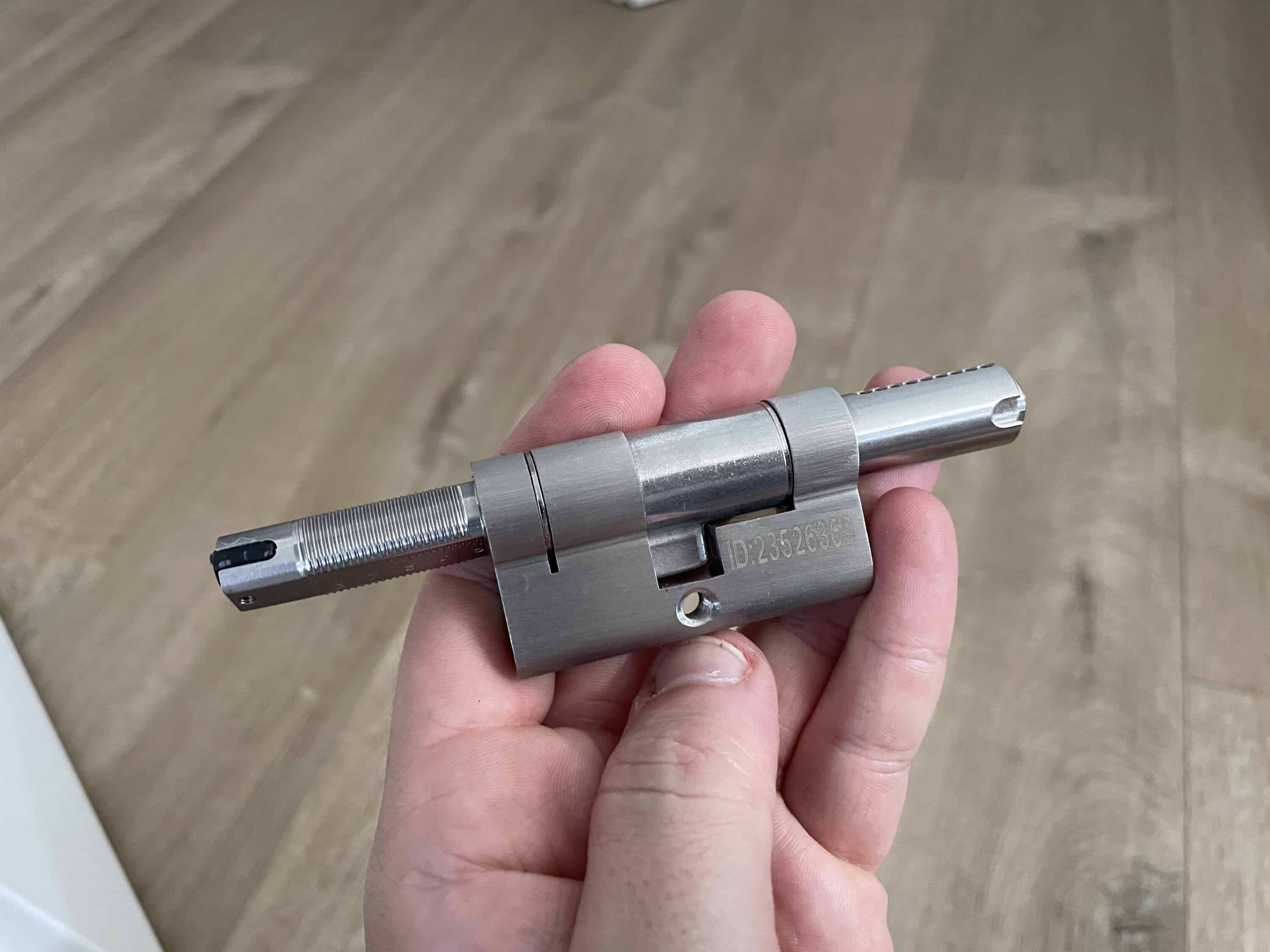 Schneller geht es aber natürlich mit einem herkömmlichen Schraubenzieher, der ein wenig größer ist. Zunächst baut man den vorhandenen Zylinder aus. Hierfür einfach die entsprechende Schraube lösen und Zylinder herausziehen.