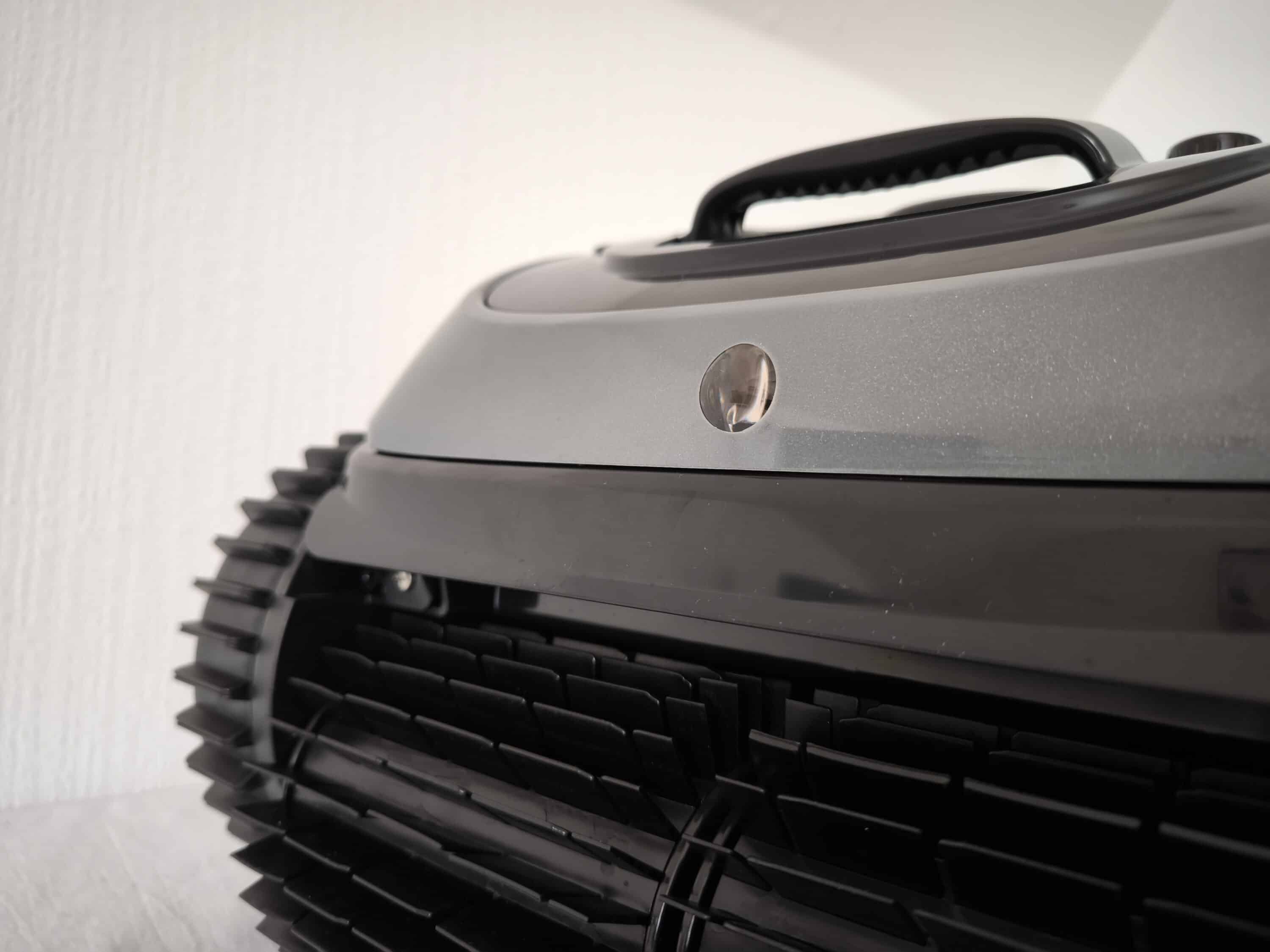 Rein optisch hat der WYBOT C1 eine Menge zu bieten. An der Vorderseite des Roboters erwarten uns zwei dicke Walzenbürsten, die zur Reinigung des Bodens dienen. Die Fortbewegung erfolgt über je eine Laufrolle auf jeder Seite, die sich über die gesamte Länge des WYBOT C1 erstreckt. Zugegebenermaßen ist der WYBOT C1 auch kein Leichtgewicht, denn mit ca. 8 kg hat man schon etwas zu schleppen. Deshalb ist der Tragegriff an der Vorderseite, der gleichzeitig als Griff für den Haken zum Herausziehen dient, eine große Hilfe.