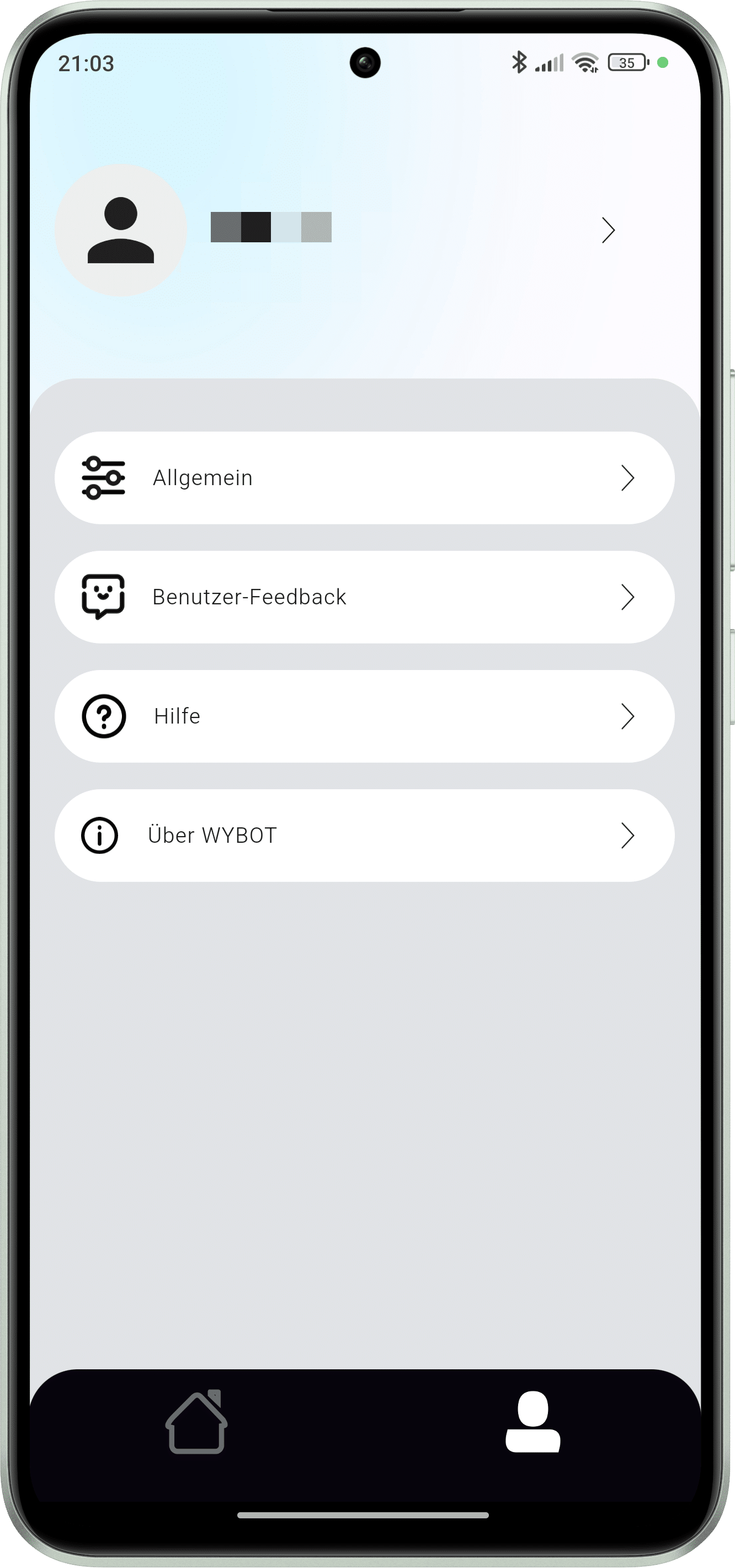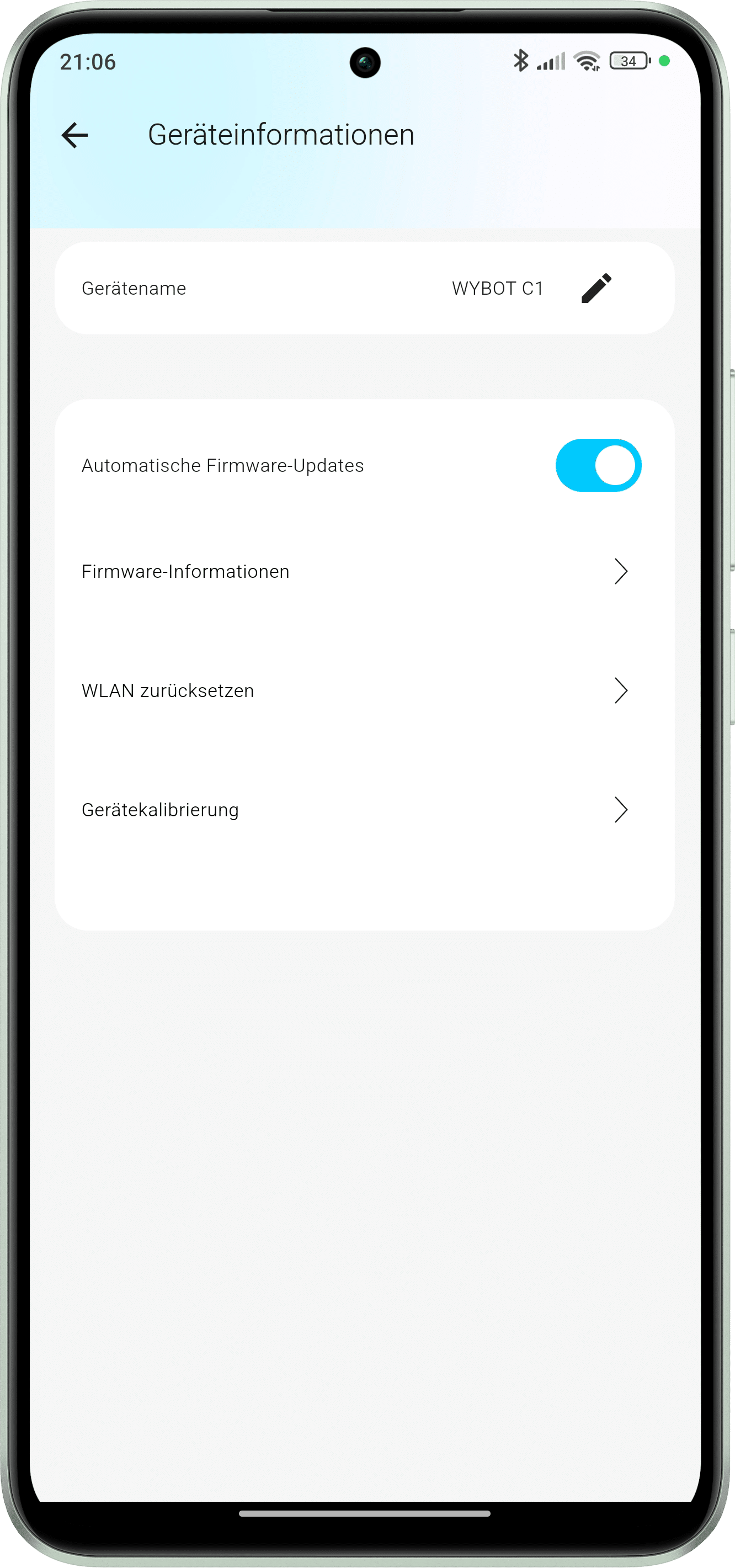 Nach anfänglichen Startschwierigkeiten bei der Registrierung bzw. beim Einloggen in die WYBOT-App und einem App-Update später können hier einige Konfigurationen für den C1 vorgenommen werden. Ja, richtig gehört, ein eigener Account bei WYBOT ist Voraussetzung für die Nutzung der App. Auf dem Startbildschirm angekommen, lässt sich unser neuer Roboter einsehen, den wir zuvor per Bluetooth mit unserem Account verbunden haben. Toll ist, dass der WYBOT C1 sowohl WLAN als auch Bluetooth unterstützt, um die Einstellungen zu konfigurieren.