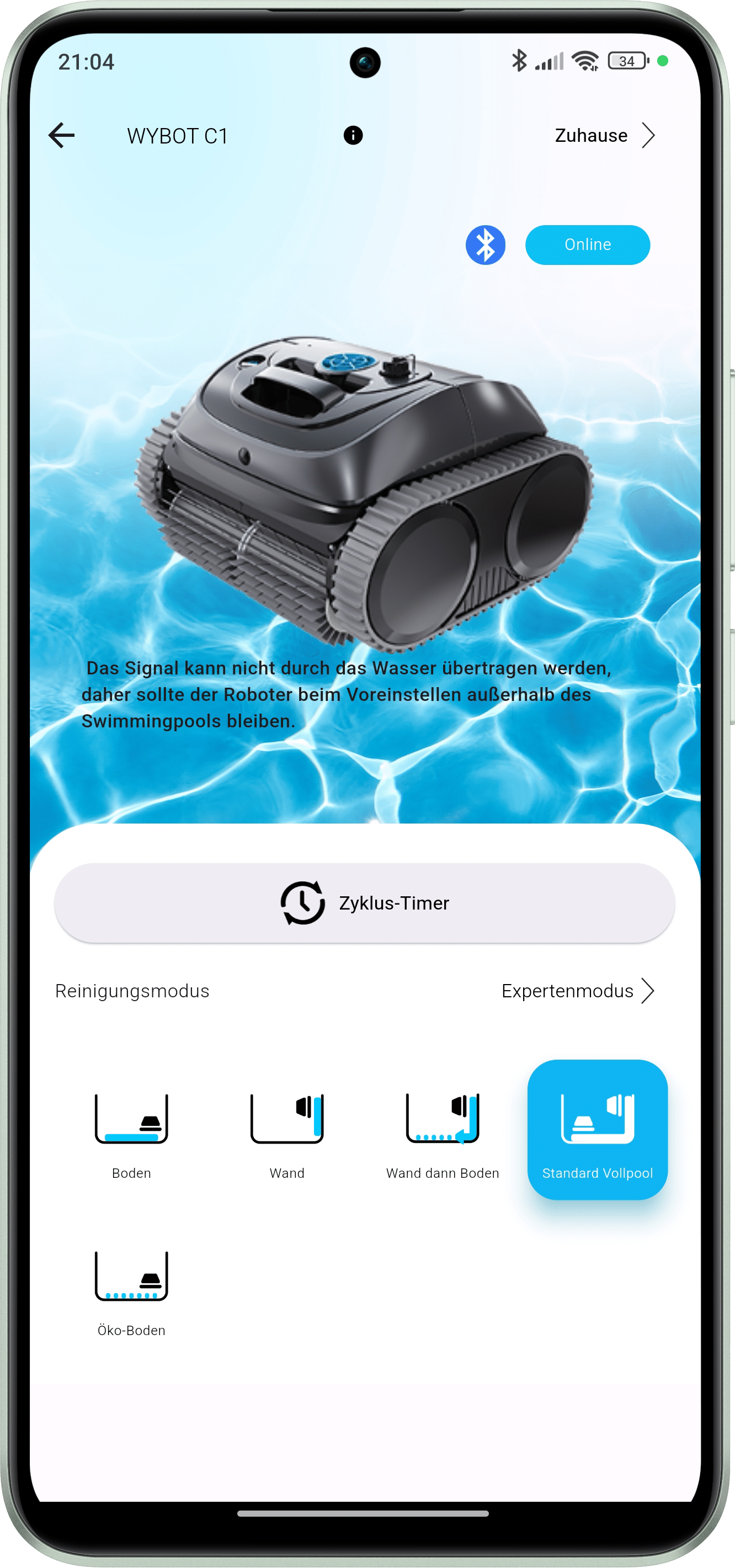 Zu Beginn empfiehlt es sich, einige Angaben zum Pool einzubinden, die unter anderem die Form, die Neigung sowie das Material des Beckens betreffen. Bei den Reinigungsmodi kann zwischen fünf Varianten gewählt werden. Neben einer reinen Wand- oder Bodenreinigung kann man auch beides zusammen durchführen oder als dritte Ergänzung die Wasserlinie wählen, was den Modus „Standard Vollbad“ beinhaltet. Bei „Öko-Boden“ hingegen wird nur der Boden gereinigt, was allerdings mit einer längeren Laufzeit einhergeht, da der WYBOT C1 hier energiesparender unterwegs ist. Standardmäßig ist jedoch „Wand dann Boden“ voreingestellt.