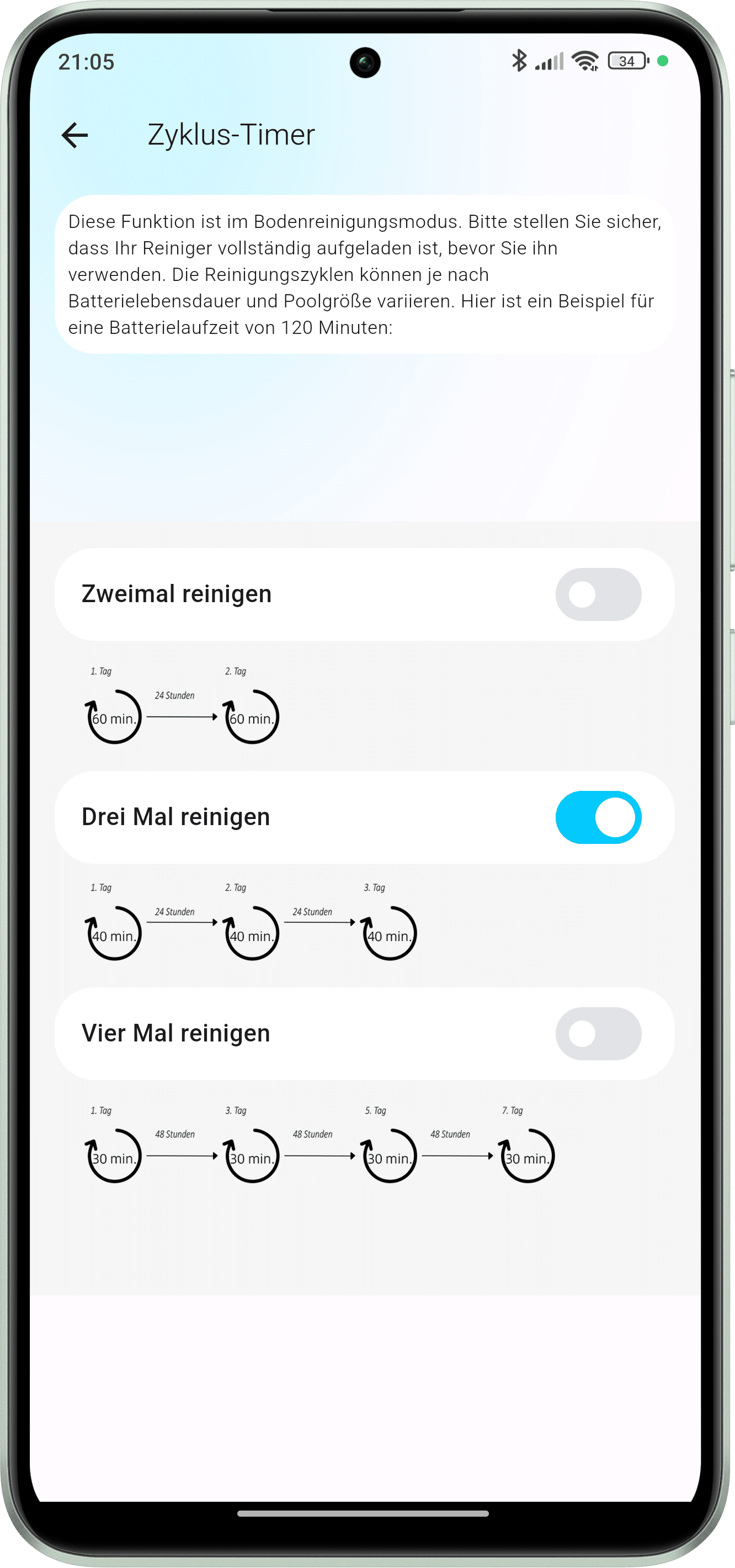 Neben einem Zyklustimer, der eine automatische Poolreinigung über mehrere Tage verteilt ermöglicht, können im Expertenmodus auch Reinigungsmuster festgelegt werden. Für die Bodenreinigung kann dazu die gängige S-Reinigungsmethodik verwendet werden, aber auch ein Kreuz- oder Sternmuster ist möglich. Die Wandreinigung erfolgt dagegen H- oder N-orientiert.