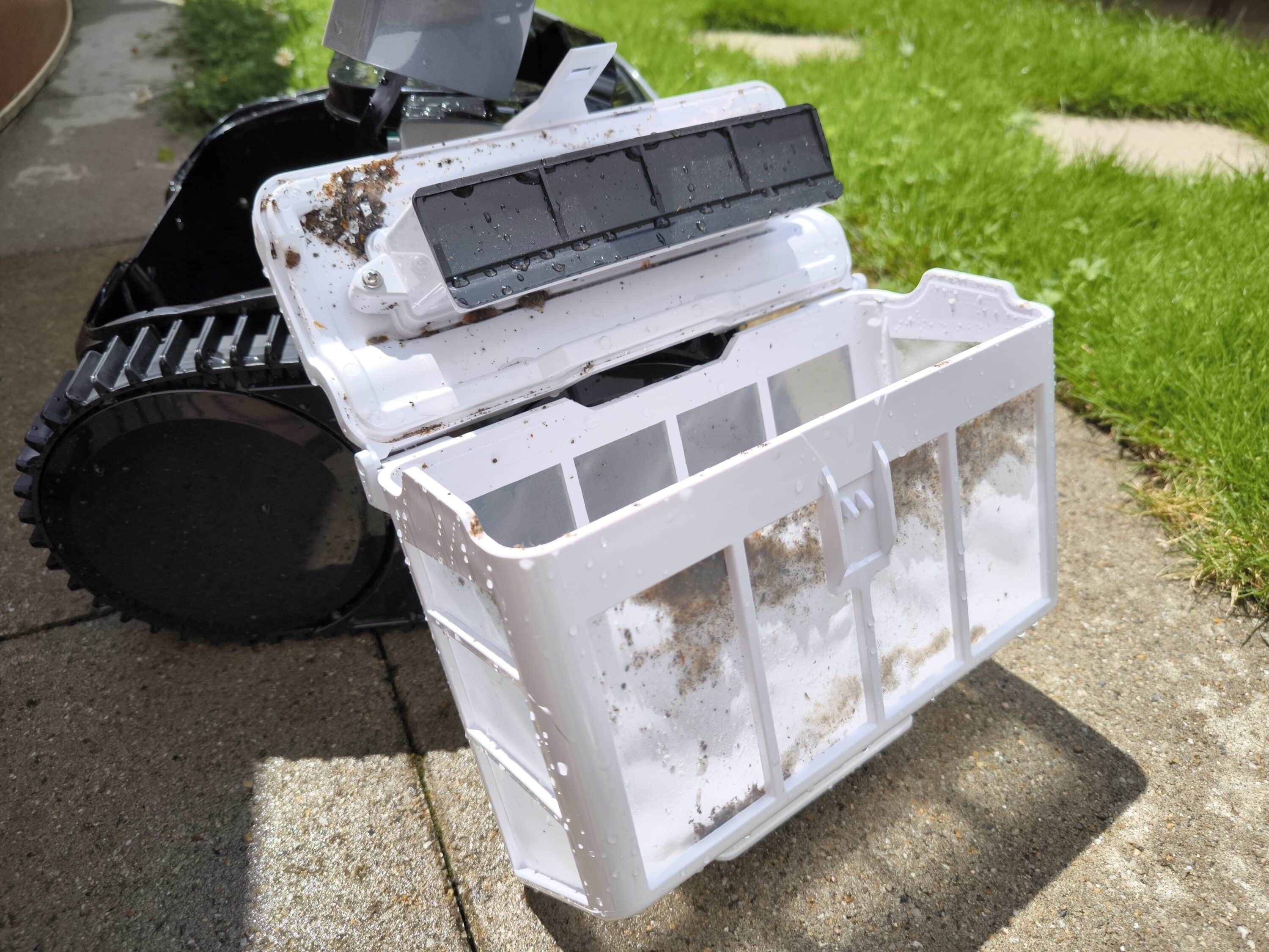 Etwas umständlich ist allerdings, dass der Filterkorb nun nicht mehr von oben geöffnet wird, sondern die Verschlussklappe unten montiert wurde. Gerade an der Unterseite bleiben nämlich einige Partikel an den Seiten haften, was bei der Reinigung eventuell etwas unangenehm sein kann. Nichtsdestotrotz kann man nun den Filterkorb mit einem Gartenschlauch komplett ausspülen und die restlichen Partikel im Mülleimer entsorgen.