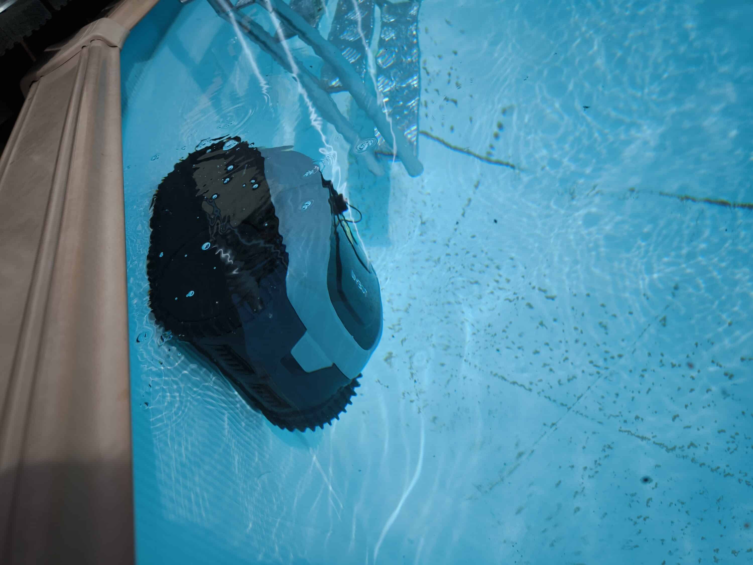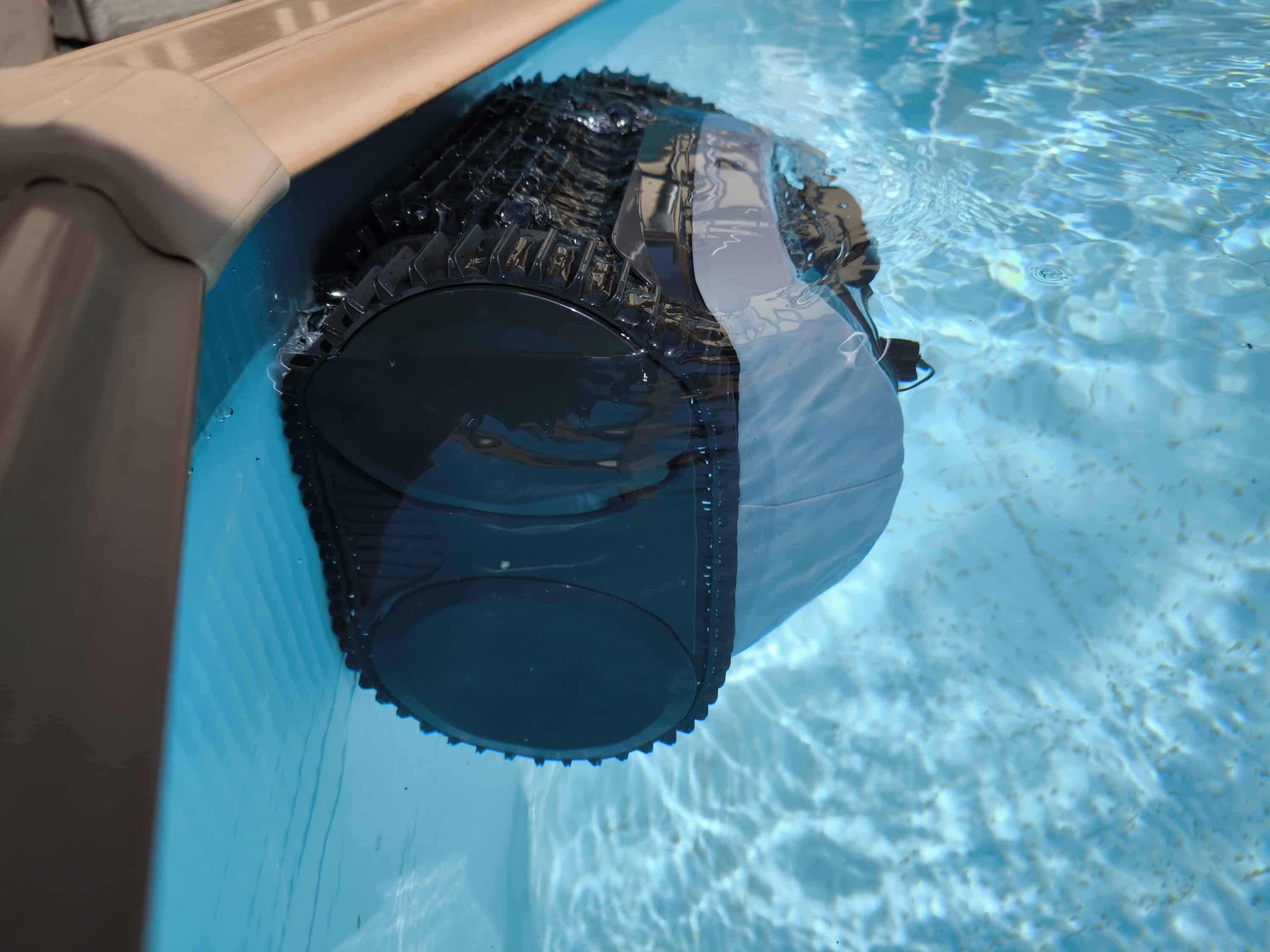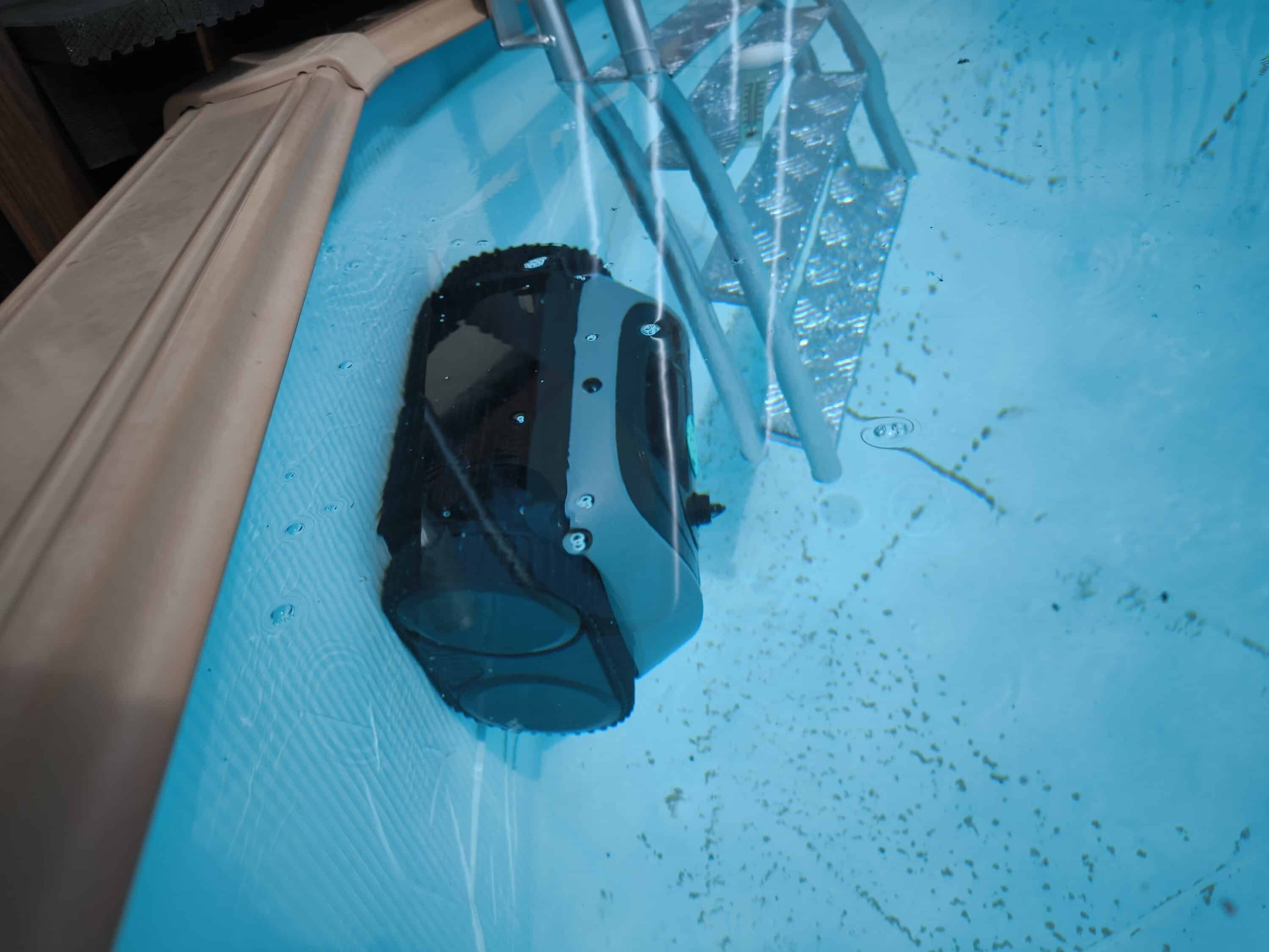 Ein deutlich besseres Ergebnis erzielt der WYBOT C1 hingegen bei der Wandreinigung. Der WYBOT C1 kann über mehrere Zyklen konstant vom Boden aufwärts bis zur Wasserlinie fahren und dabei kontinuierlich Schmutzpartikel absaugen. Dabei fährt der Poolsauger sogar bis zur Beckenoberkante, bis er einige Zentimeter aus dem Wasser ragt. Dies hat den Vorteil, dass gerade eventuell an der Wasseroberfläche befindliche Mücken oder andere Insekten eingesaugt werden.