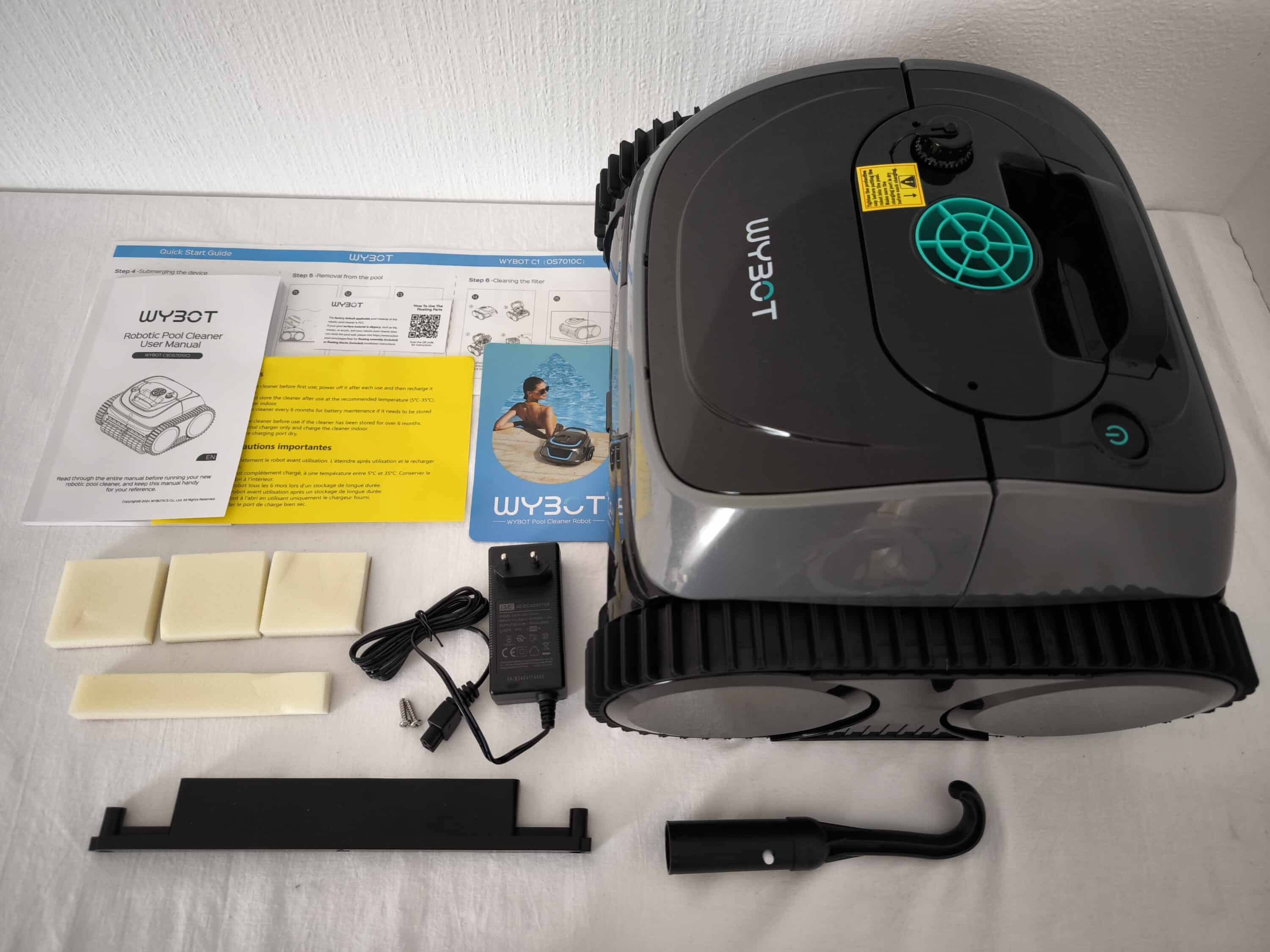 Zum Lieferumfang des WYBOT C1 gehört neben dem Schwimmbecken-Reinigungsroboter selbst natürlich auch das entsprechende Netzteil. Als weiteres Zubehör sind ein Satz Schwimmelemente und ein Greifhaken enthalten. Die übliche Bedienungsanleitung sowie die Schnellstartanleitung dürfen natürlich auch nicht fehlen.