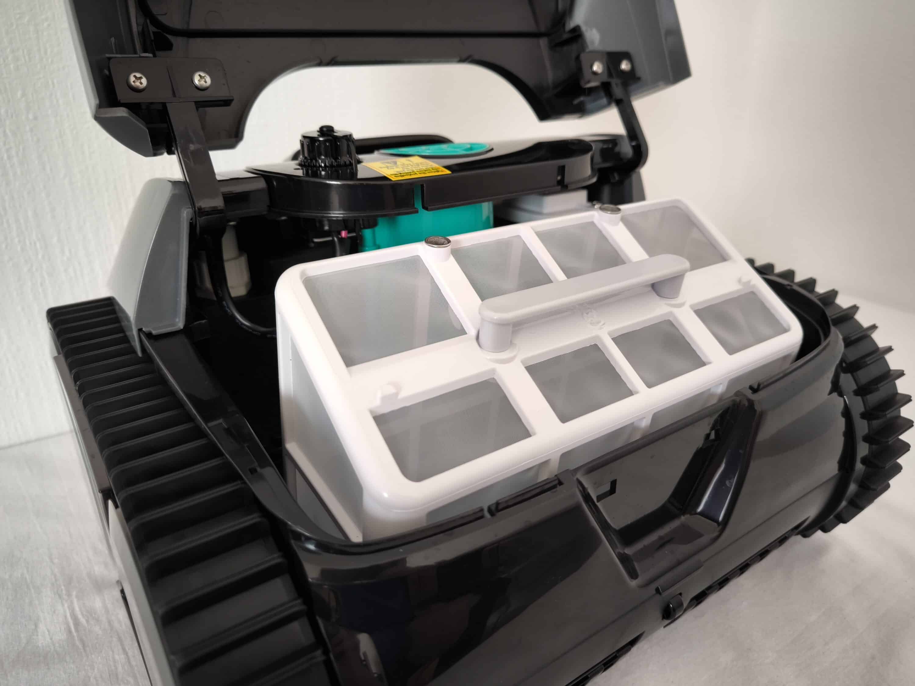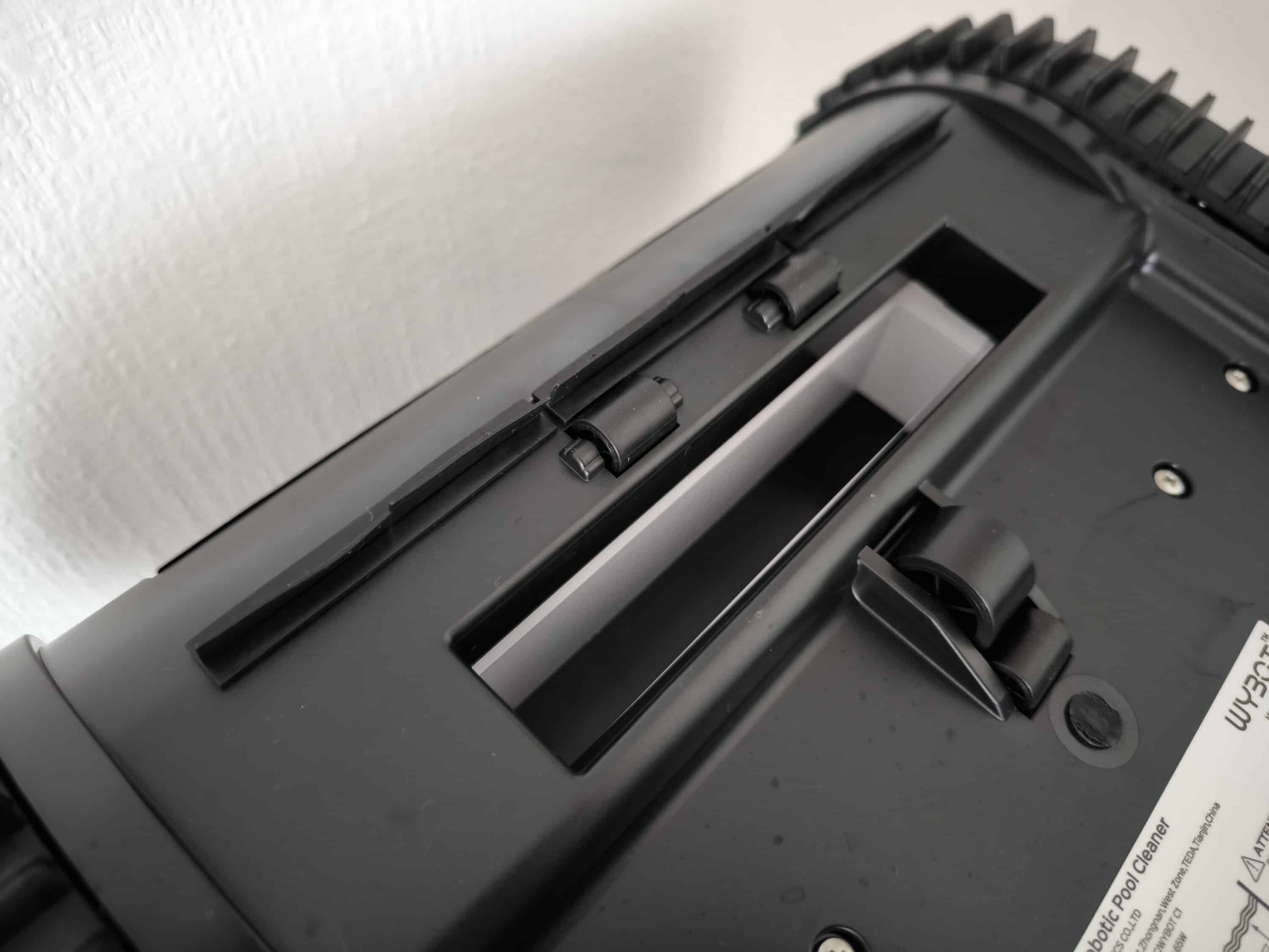 Nach der Reinigung muss der Filterkorb des WYBOT C1 entleert und vollständig ausgespült werden. Dazu muss die graue Halterung auf der Seite mit dem WYBOT-Logo geöffnet werden, so dass der Gehäusedeckel nach oben klappt. Nun hat man den Filterkorb vor sich und kann ihn nach oben herausnehmen.