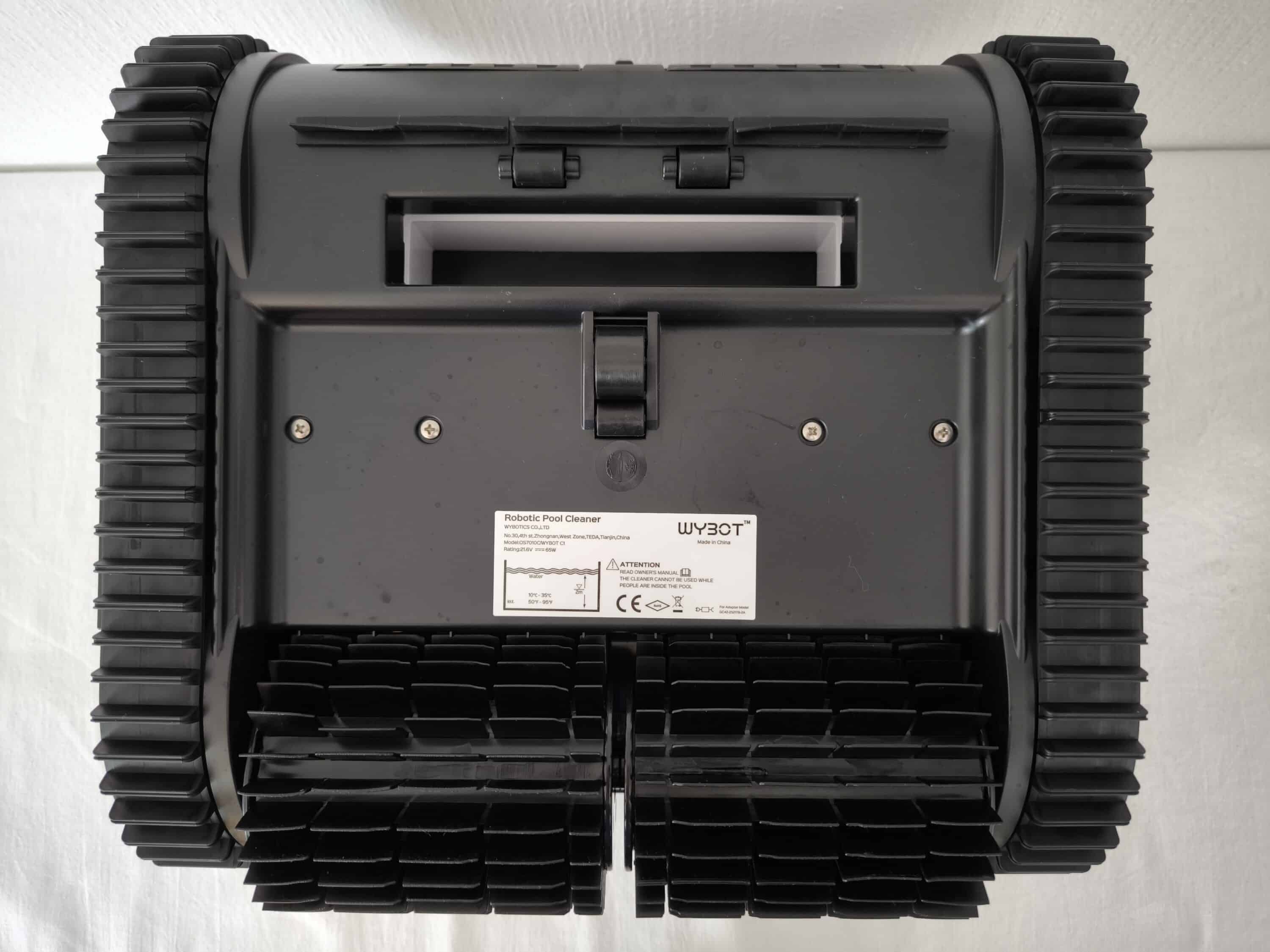 Ein Blick auf die Unterseite zeigt den großen Einlass zum Absaugen aller Schmutzpartikel. Einige Zentimeter darüber sind sechs gummierte Halterungen angebracht, die zum Abreiben dienen. Auf der anderen Seite ist das Typenschild des WYBOT C1 zur Kennzeichnung aufgeklebt.