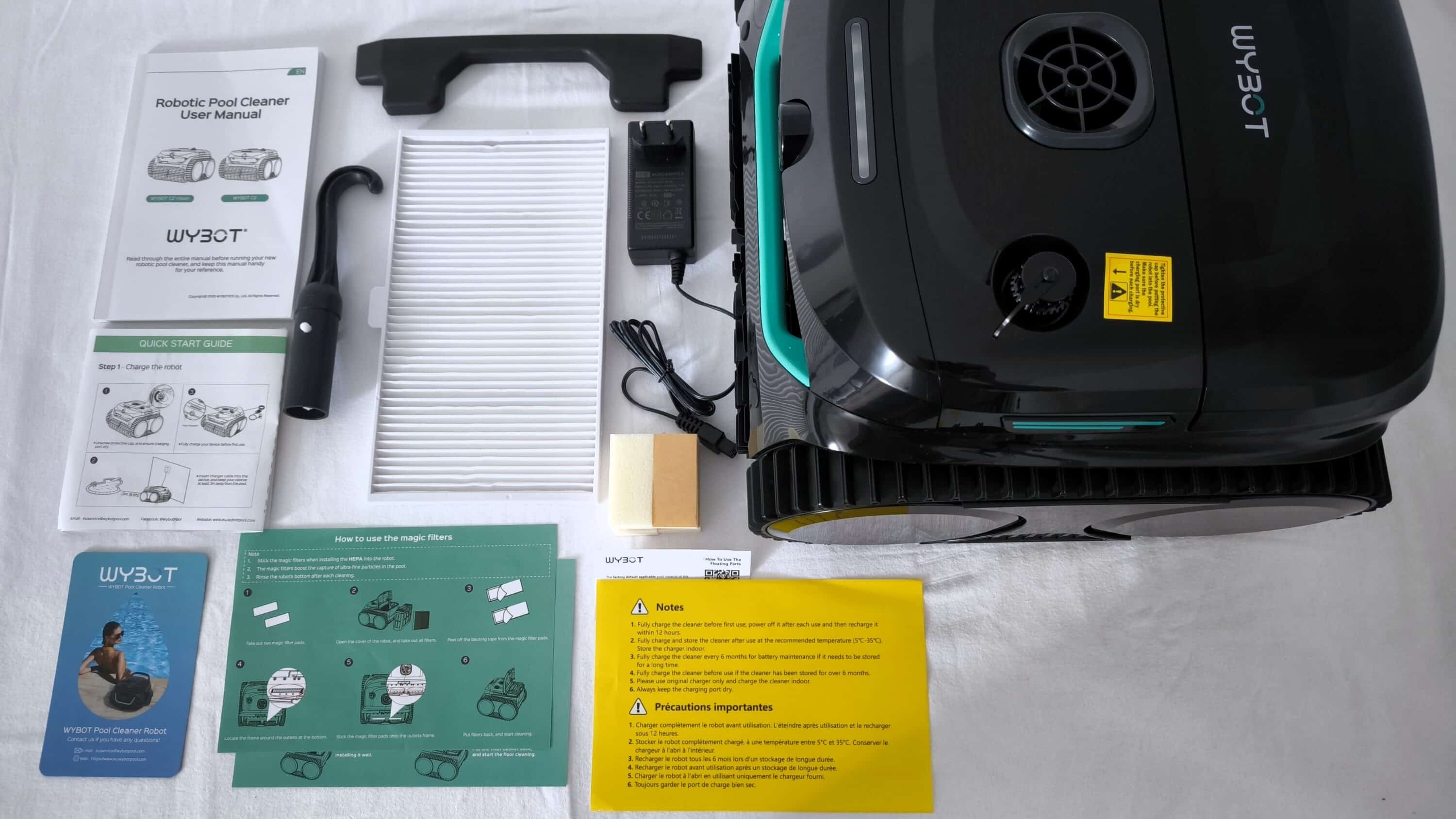 Der Lieferumfang des Poolroboters WYBOT C2 Vision umfasst neben dem Gerät selbst auch das zugehörige Netzteil und einen Rückholhaken. Zusätzlich ist ein zweiter Filtereinsatz enthalten, welcher als Feinstaubfilter optional zum Einsatz kommen kann. Für eine einfachere Navigation im Pool erhält man außerdem einige Schwimmelemente, deren Nutzung jedoch nicht zwingend erforderlich ist. Komplettiert wird der Lieferumfang durch die Bedienungsanleitung samt einiger weiterer Gebrauchsanweisungen.
