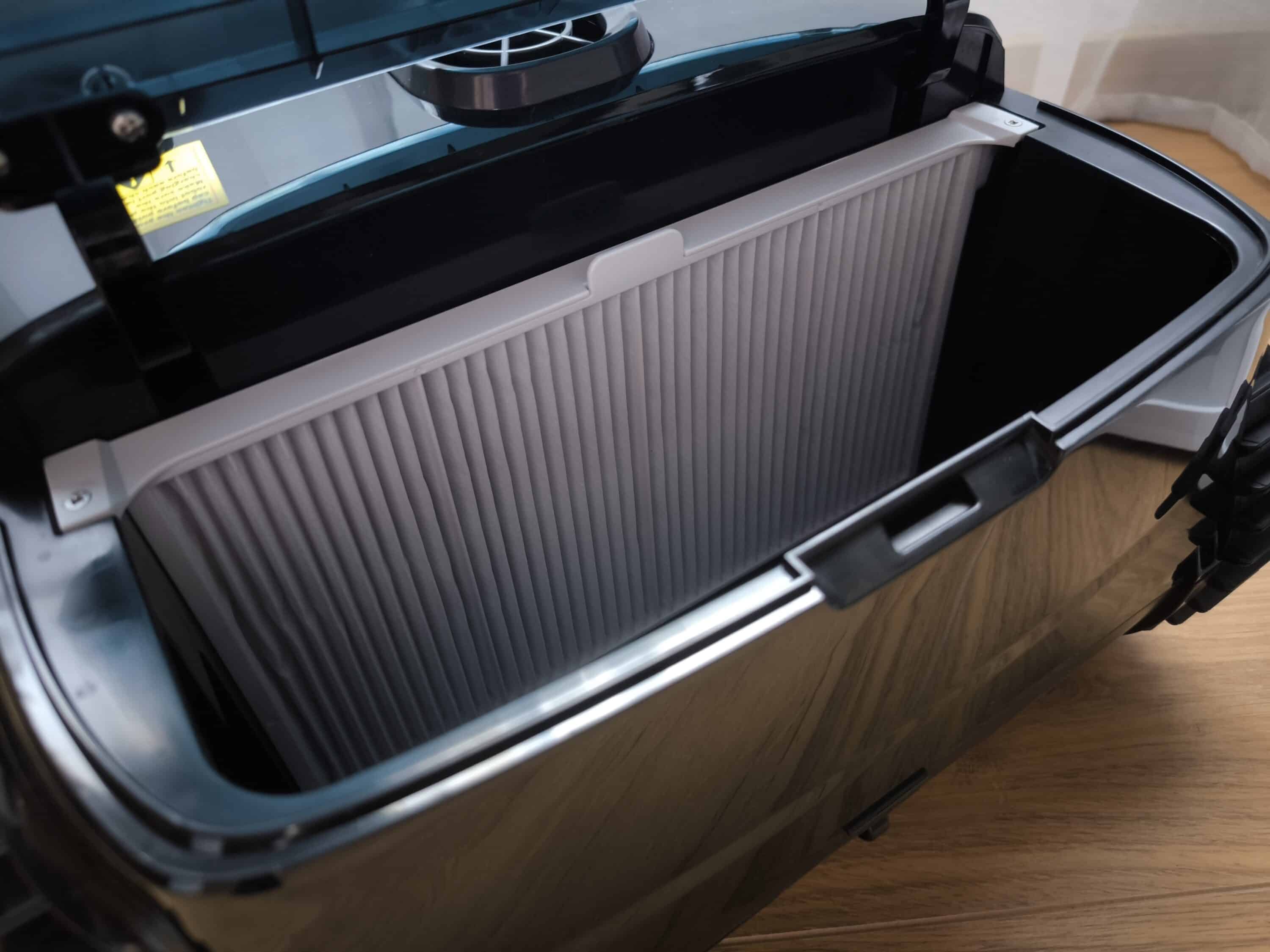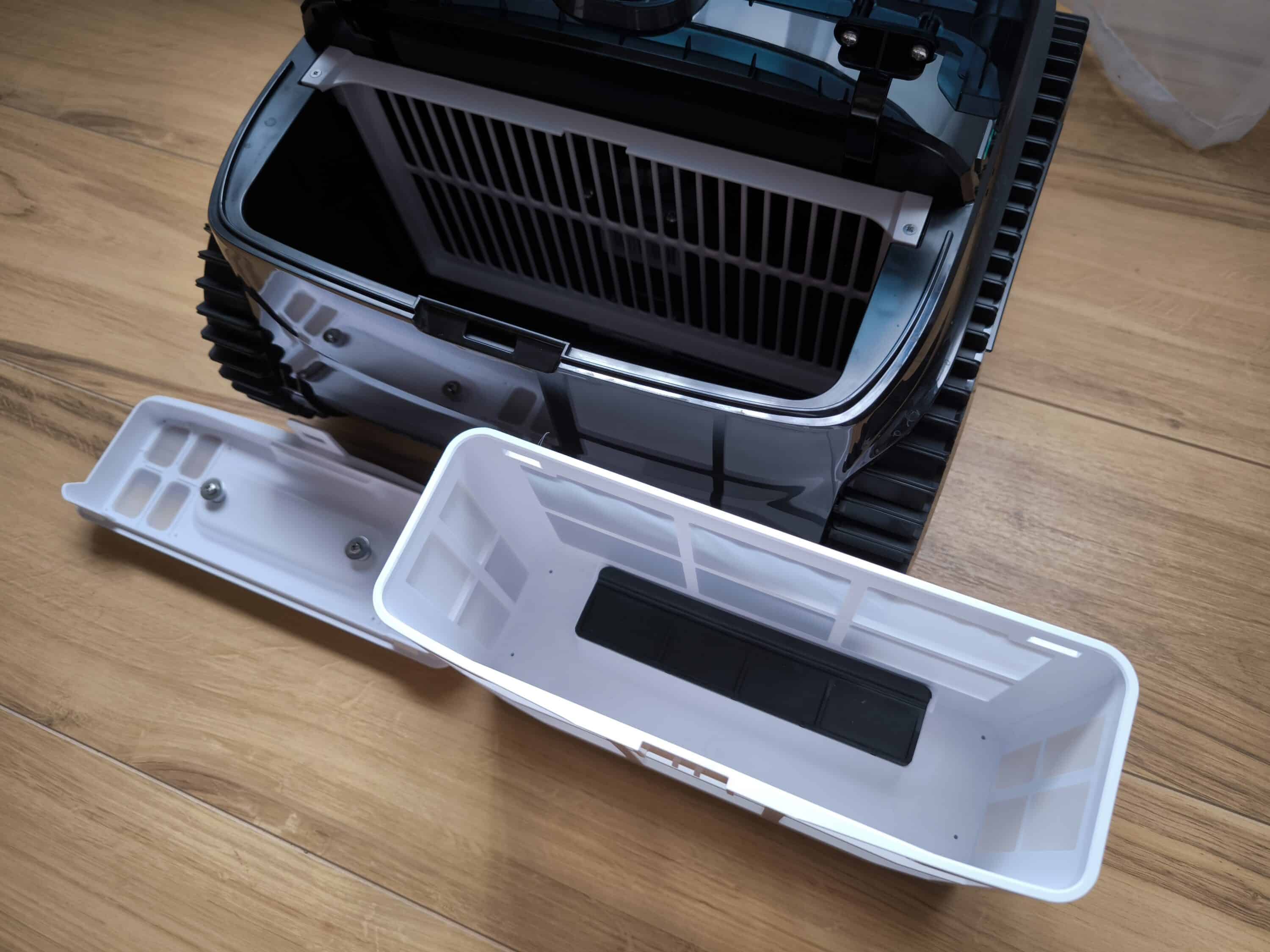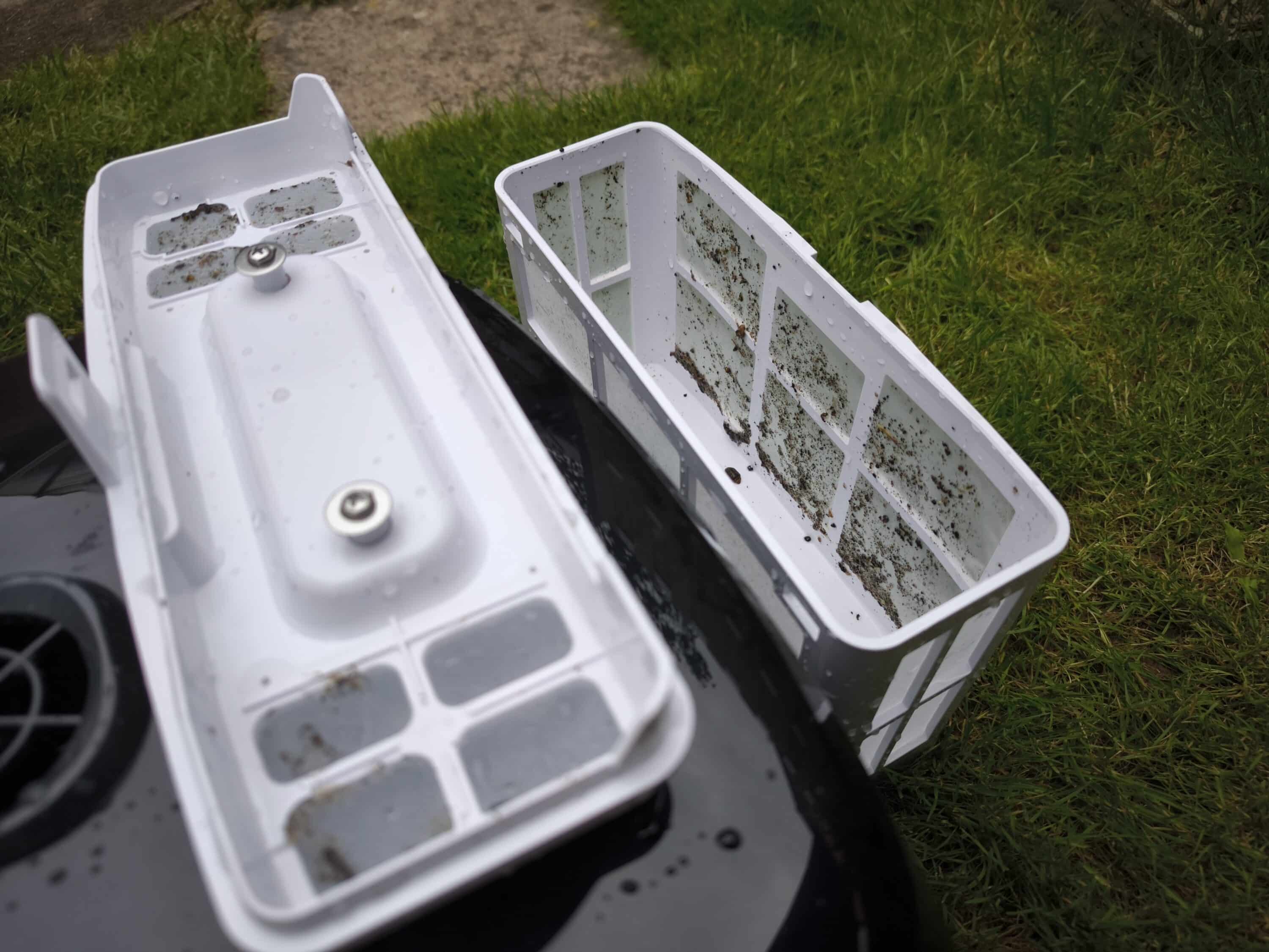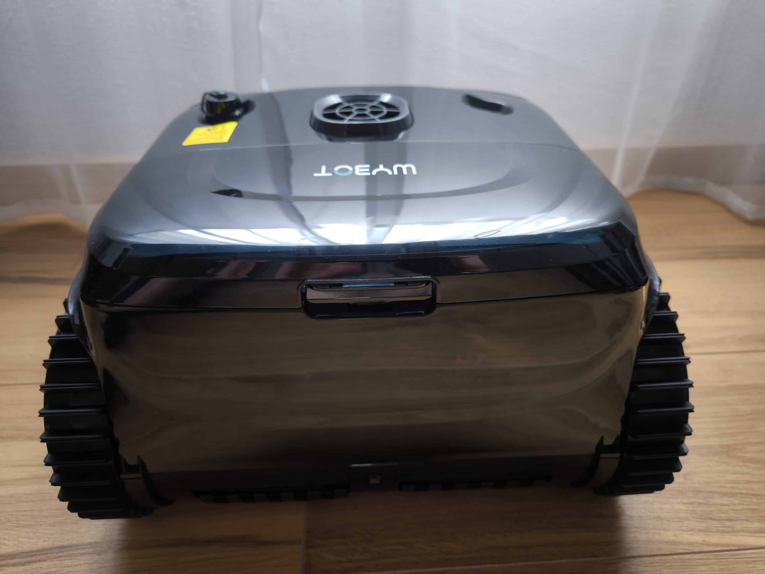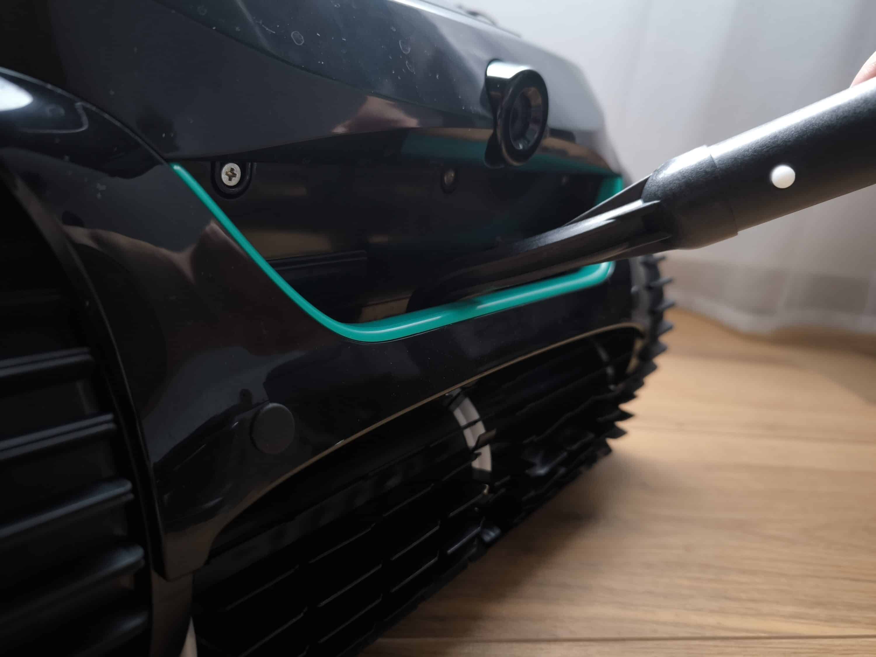 Zum Säubern des Poolroboters zieht man die Halterung auf der Rückseite nach oben, wodurch sich der Gehäusedeckel öffnet. Zum Vorschein kommt der Filterkorb, welcher sich ebenfalls herausnehmen lässt. Eine positive Neuerung beim WYBOT C2 Vision ist, dass die Verschlussklappe wieder oben positioniert wurde. Zum Vergleich: Beim WYBOT C1 musste man den Filterkorb von unten öffnen wo allerlei Rückstände direkt haften blieben.