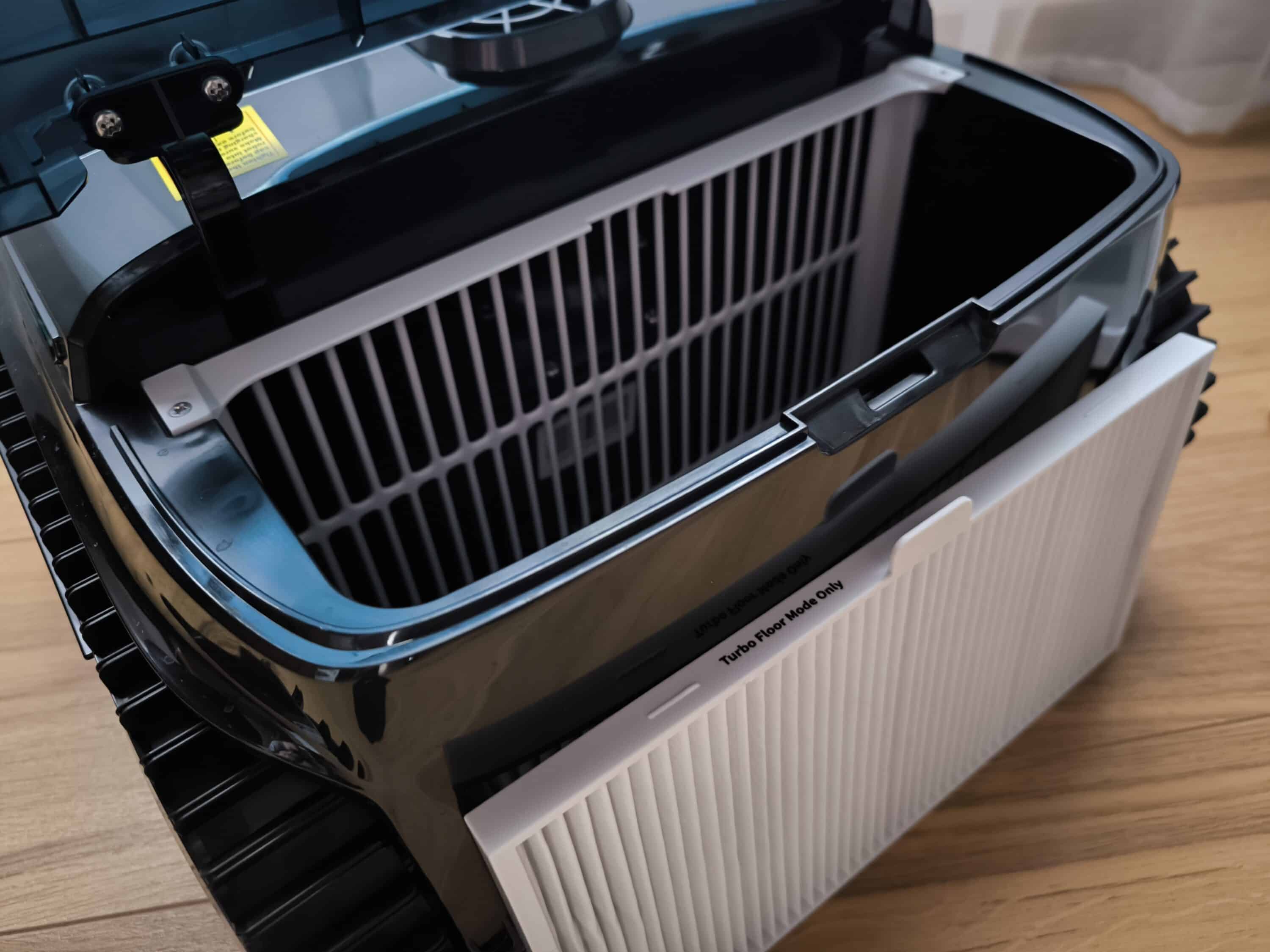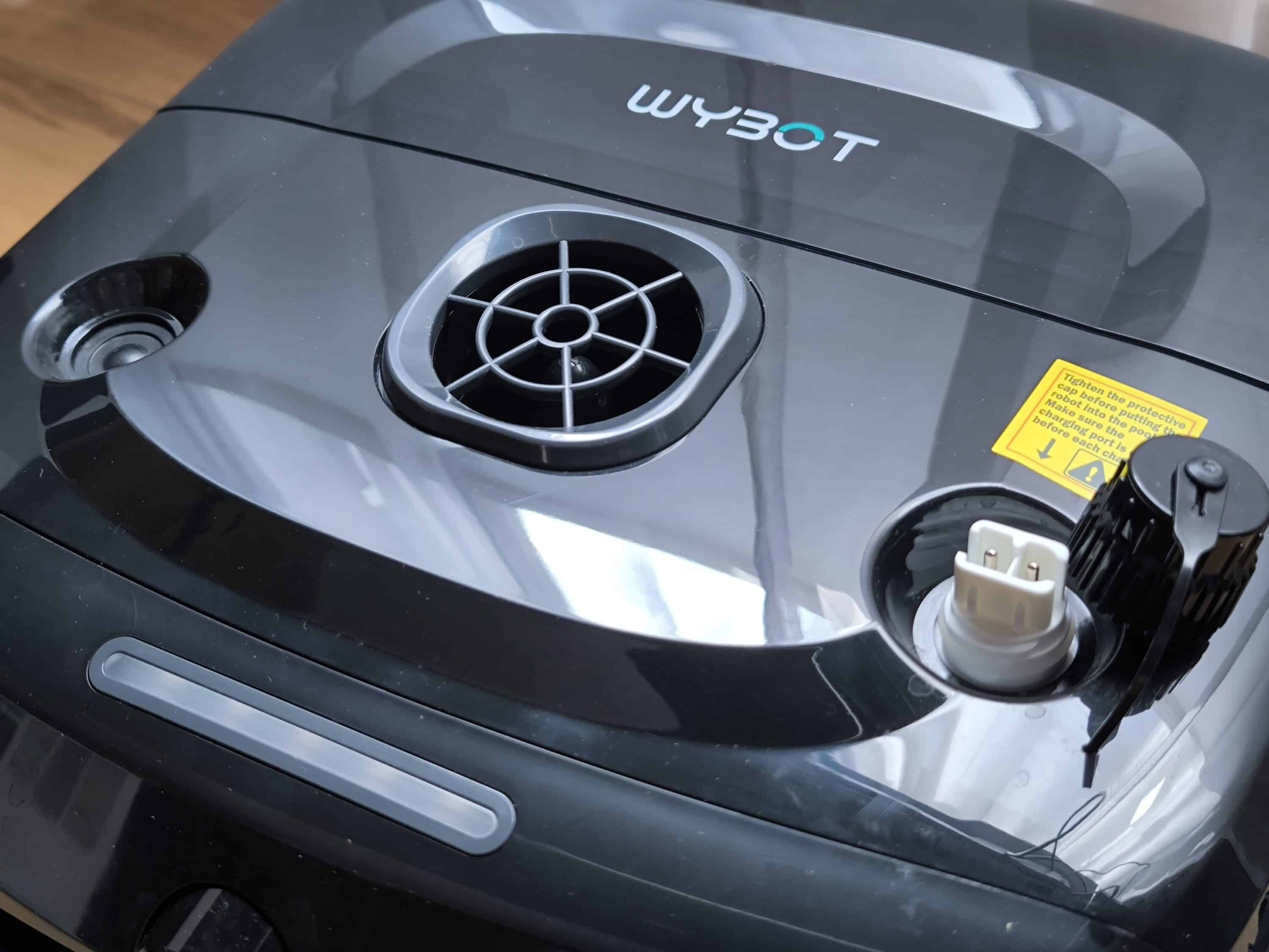 Vom Design her ähnelt der WYBOT C2 Vision ohnehin deutlich dem Vorgängermodell und weist viele Gemeinsamkeiten auf. Hierzu zählen der linke Bedienknopf auf der Oberseite, der mittig angebrachte Lüfter wie auch der Stromanschluss rechts daneben. Der etwas schmale Tragegriff des Vorgängermodells ist nun weiter nach vorne gewandert und sitzt somit direkt über den beiden dicken Walzenbürsten. Durch diese Veränderung ergibt sich Platz für eine zusätzliche LED-Leiste sowie eine KI-Vision-Kamera. Auf der gegenüberliegenden Seite befindet sich im Innenraum der Filterkorb. Dessen Gehäuse lässt sich von außen per Druckknopf aufklappen.