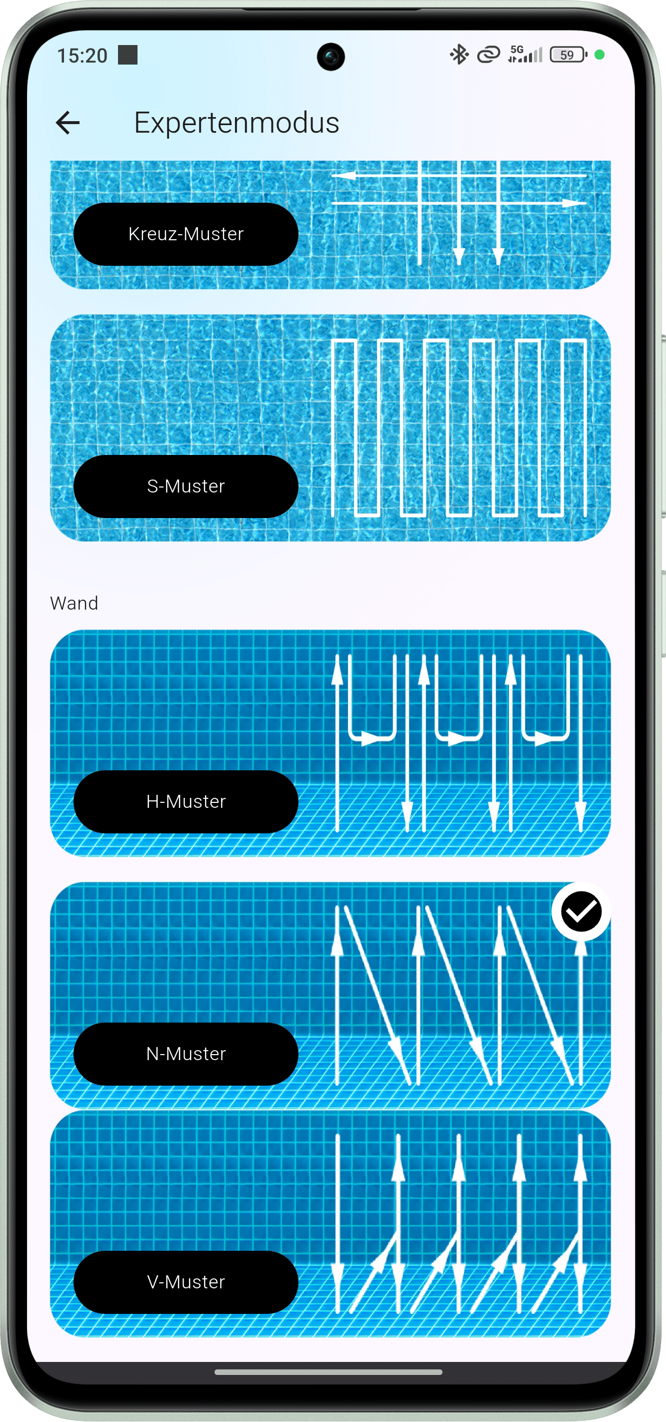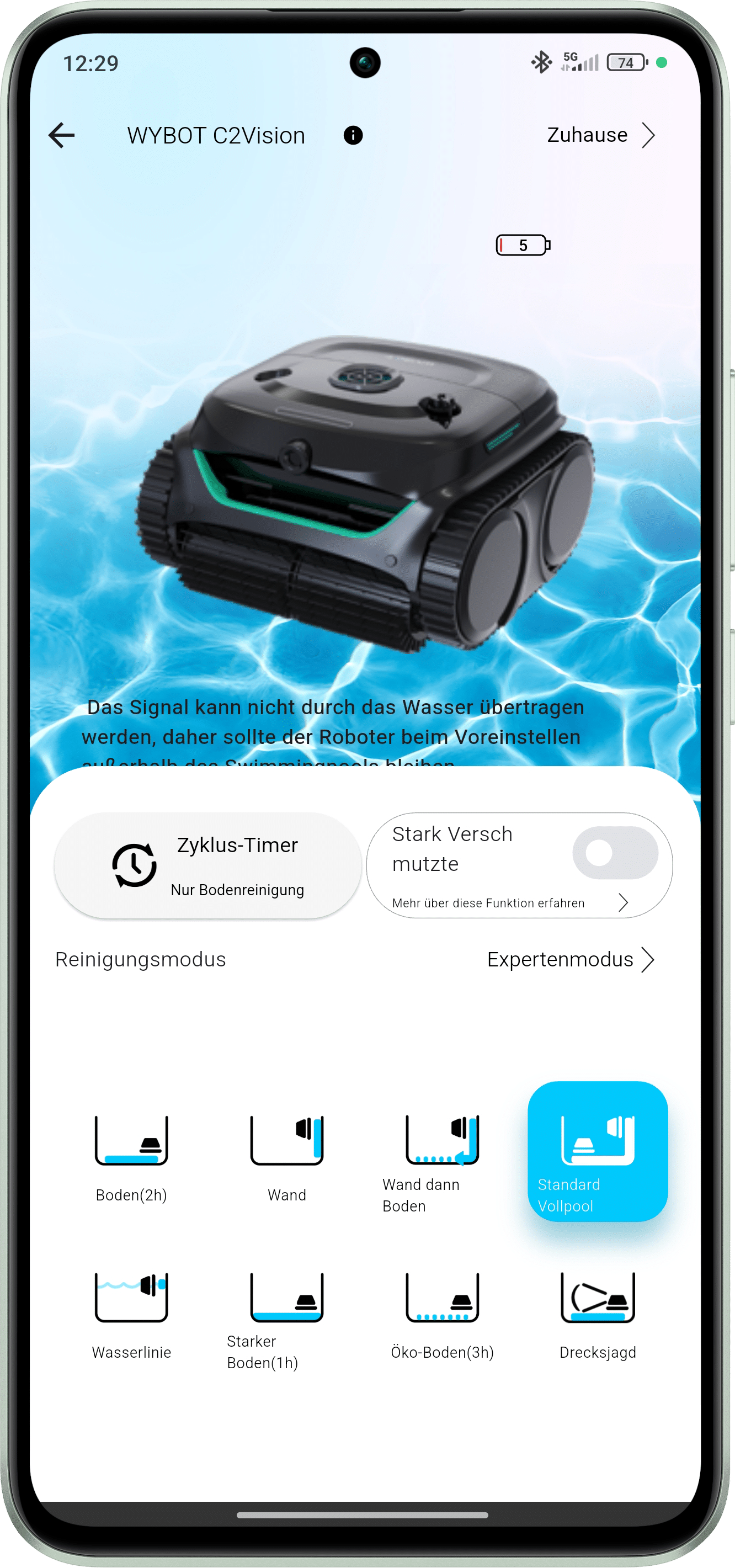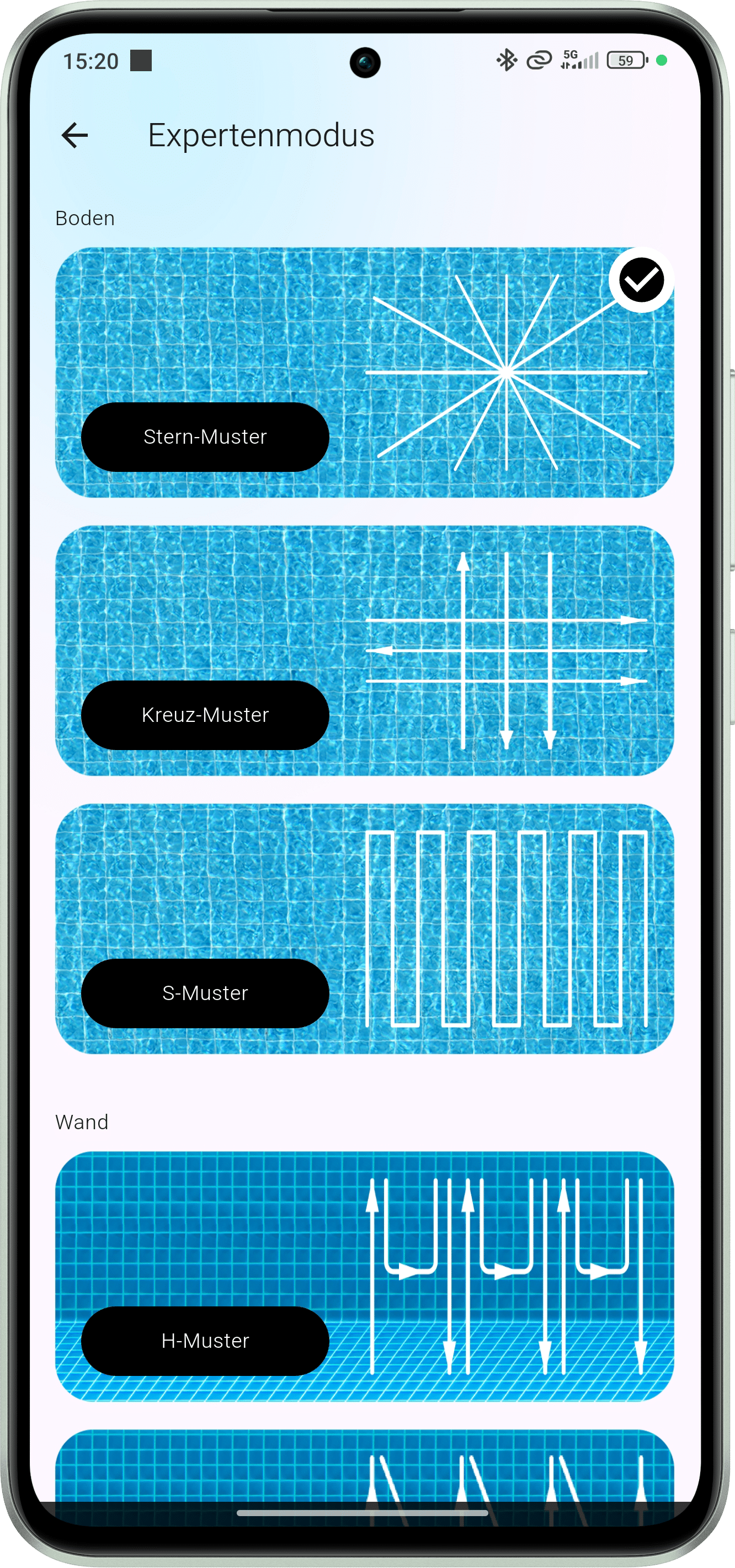 Zu den Neuerungen zählt ein Sonderprogramm für starke Verschmutzungen, welches sich insbesondere zum Saisonstart nach den kalten Wintermonaten oder nach längerer Inaktivität empfiehlt. Weiterhin gibt es wie beim WYBOT C1 den Zyklustimer, wodurch der Poolroboter mehrere Tage im Pool bleiben kann und z. B. alle 24 Stunden seine Runden dreht. Auch die Auswahl der Pfadplanung lässt sich über den Expertenmodus festlegen. Dafür stehen sowohl für die Boden- als auch für die Wandreinigung jeweils drei Muster zur Verfügung.