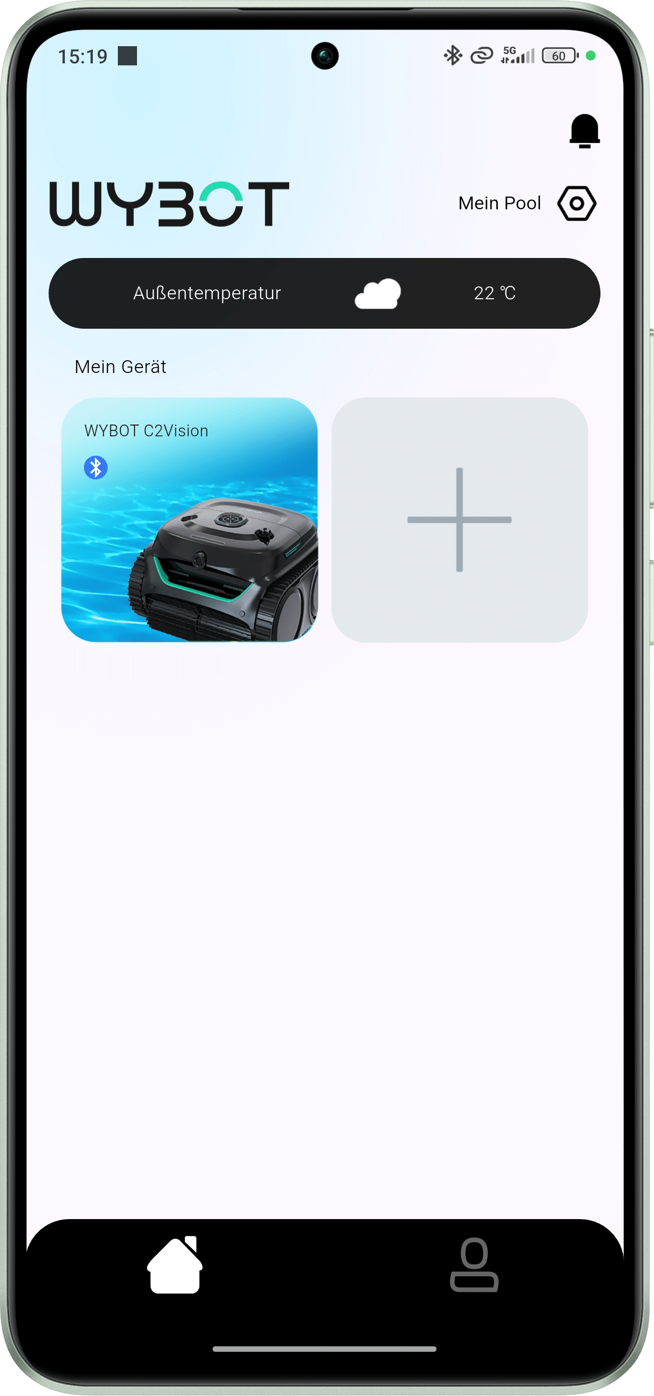 Für weitere Funktionen des WYBOT C2 Vision steht die App „WYBOT” des Herstellers zur Verfügung. Hierfür ist die Erstellung eines Accounts notwendig, sofern man bislang kein Konto besitzt. Im Anschluss gelangt man direkt zum Homescreen der App, über den sich der neue Poolroboter per Plus-Symbol ganz einfach hinzufügen lässt. Während der initialen Einrichtung ist eine aktive Bluetooth-Verbindung nötig, danach lässt sich der Poolroboter per WLAN bedienen.