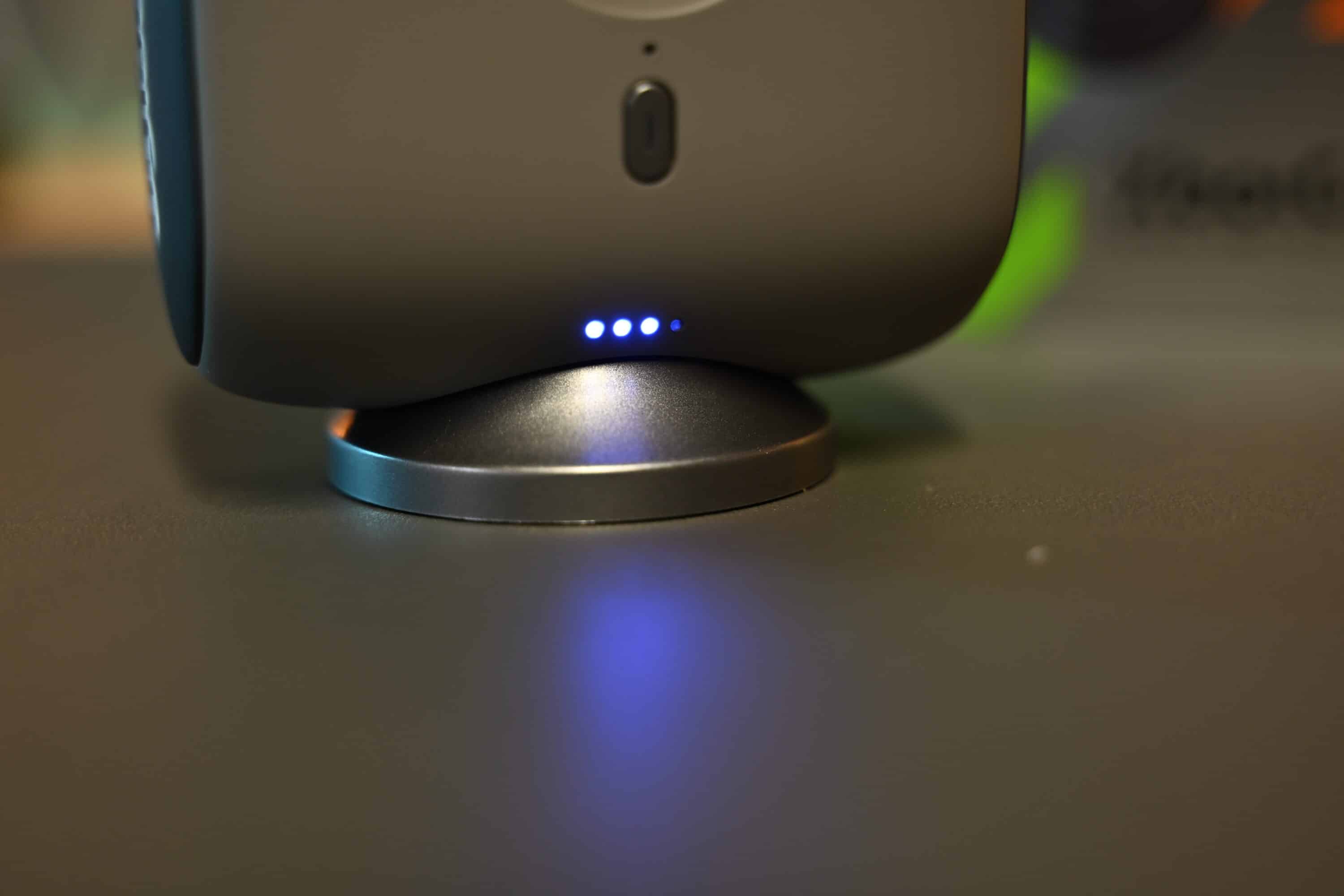 Den Power-Button findest du hingegen an der Vorderseite. Er dient zudem für das Bluetooth-Pairing, wobei eine blaue Status-LED über die verbleibende Akkulaufzeit informiert. Ist das Chameleon eingeschaltet, leuchten die beiden XbotGo-Logos an den Seiten zudem weiß auf.
