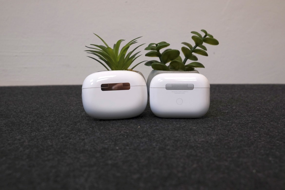 An der Vorderseite prangt das Herstellerlogo unter einer LED, die über den Akkustand informiert. Darüber positioniert man in einer kleinen Einbuchtung die Öffnung, an der der Deckel mit dem Etui verbunden ist. Ein USB-C-Eingang befindet sich an der Unterseite, über den das Ladeetui mit Energie versorgt wird. Rechts finden wir einen runden Knopf, mit dem das Pairing angestoßen werden kann.