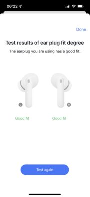 Ähnlich wie die AirPods Pro werden auch die Du Smartbuds Pro ins Ohr eingesetzt und dann leicht eingedreht, um einen idealen Sitz zu ermöglichen. Praktischerweise gibt es innerhalb der Begleit-App zudem einen „Fit Test“, der Aufschluss über den bestmöglichen Sitz der Earbuds liefert. So lässt sich der Tragekomfort zusätzlich verbessern.