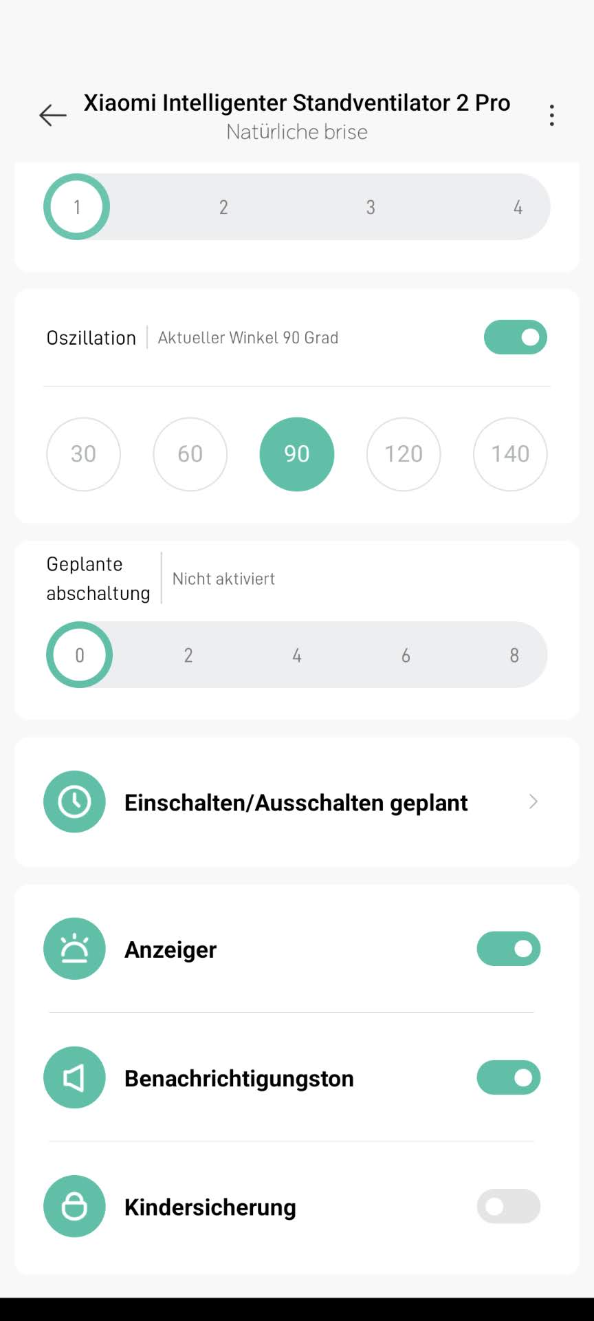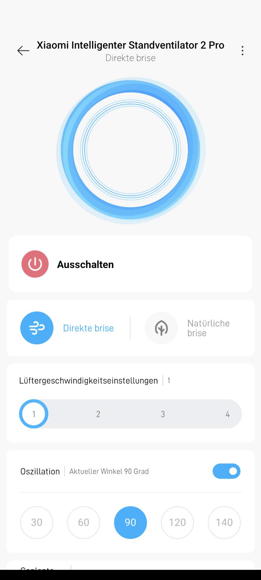 - Oszilation aktivieren/deaktivieren – der Standardwinkel beträgt 90°C und kann in der App angepasst werden, nach dem Einschalten wird der zuletzt eingestellte Winkel verwendet