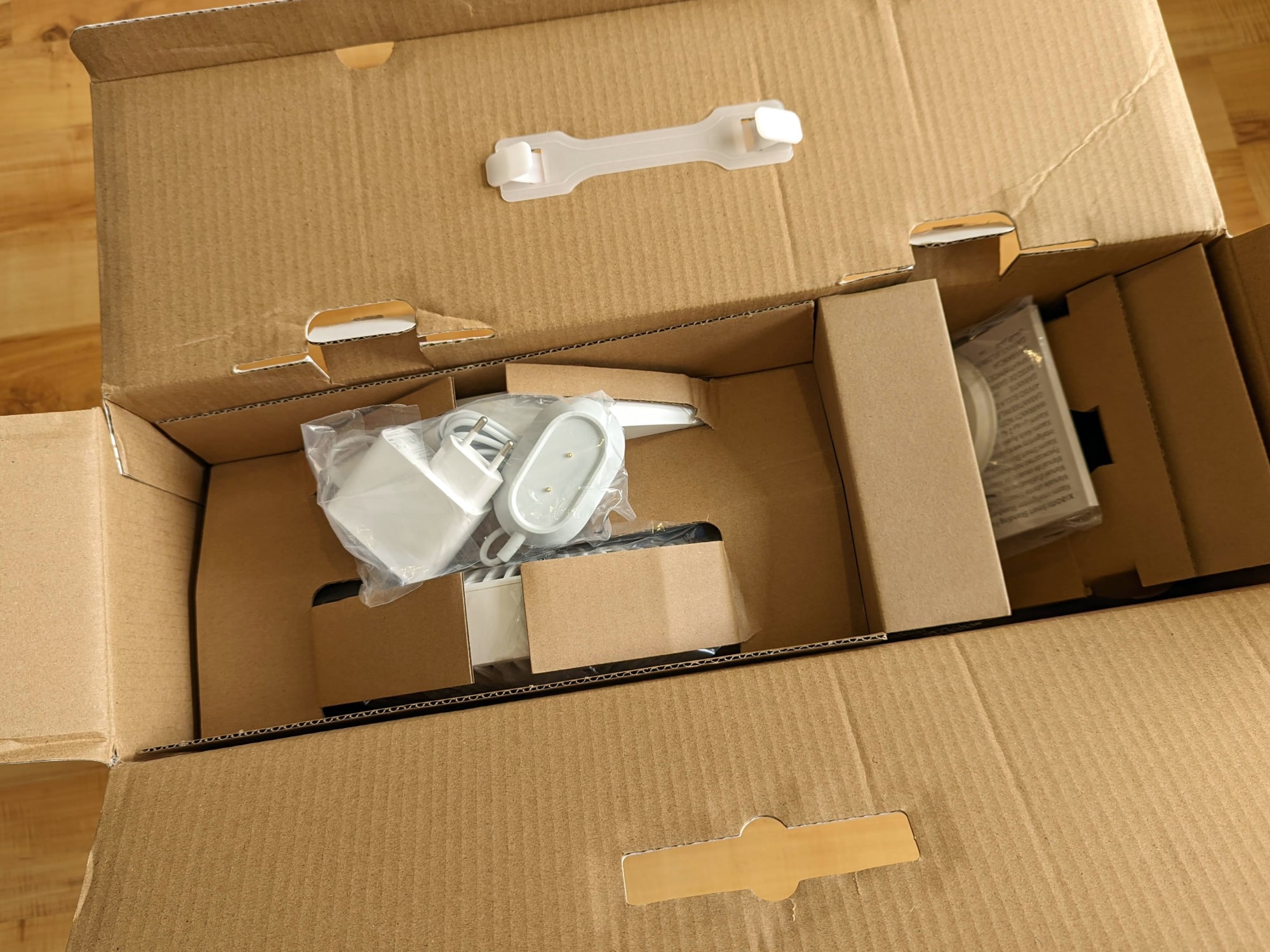 Der Karton des Xiaomi Smart Standing Fan 2 Pro ist für einen Standventilator relativ kompakt. Dies liegt daran, dass er höhenverstellbar ist und sich statt einer langen Stange, eine kürzere, samt Motor, und eine Verlängerung im Karton befinden. Weiterhin finden wir dort den Ventilatorensockel, die Ventilatoren-Baugruppe sowie eine Tüte mit weiteren Teilen, die für den Zusammenbau nötig sind. Das Laden bzw. die Stromversorgung erfolgt über eine Ladestation mit 1,60 m langem Kabel.