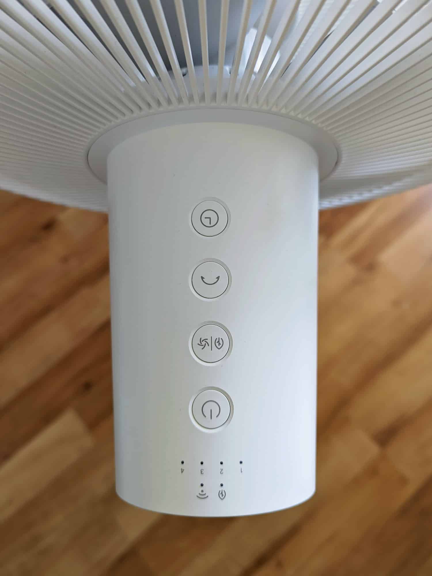 Die Bedienung des Xiaomi Smart Standing Fan 2 Pro ist direkt am Gerät, oder auch per App- oder Sprachsteuerung möglich. Auf der Oberseite des Motors findet man vier hintereinander angeordnete Tasten, den folgenden Funktionen: