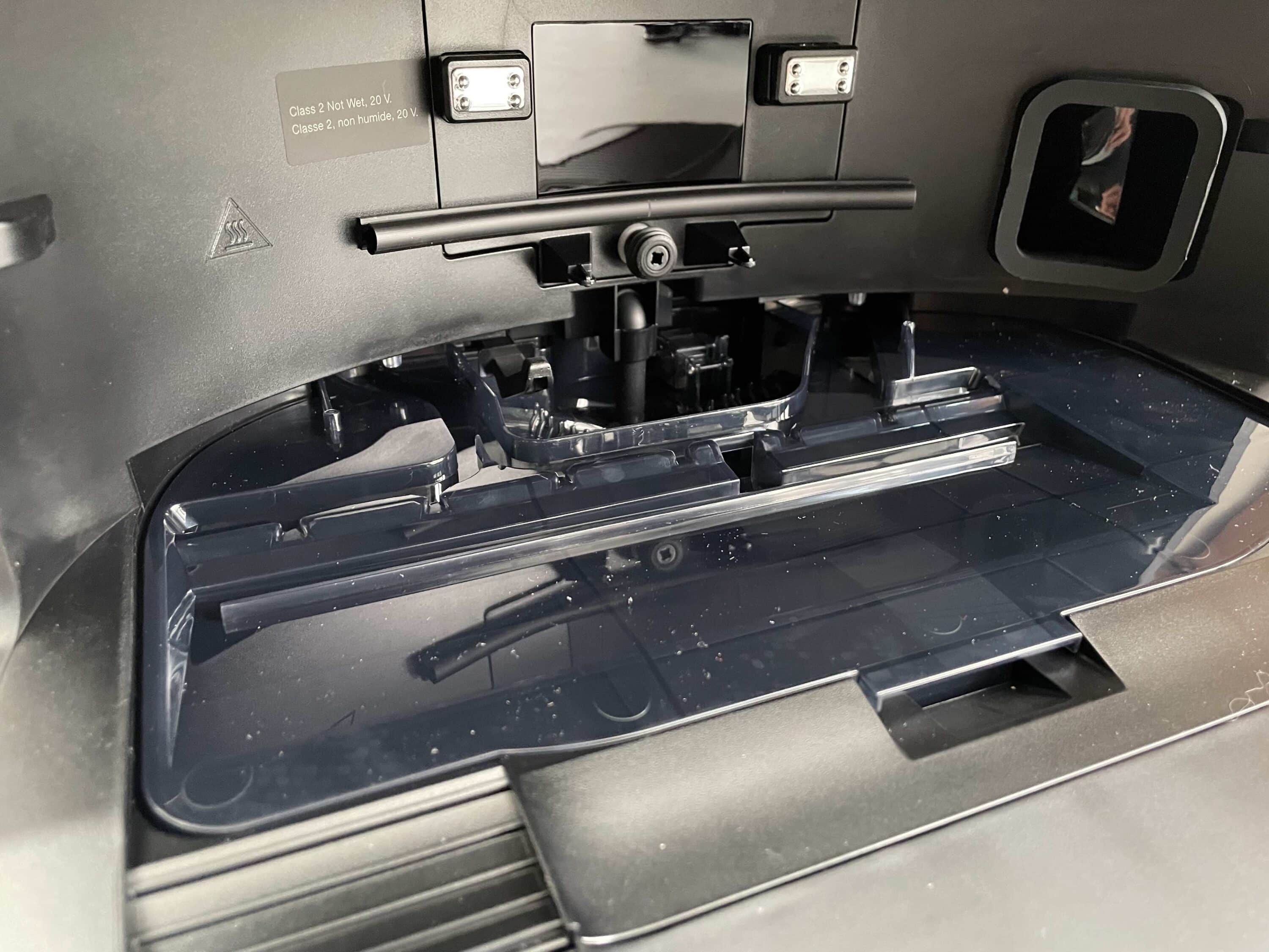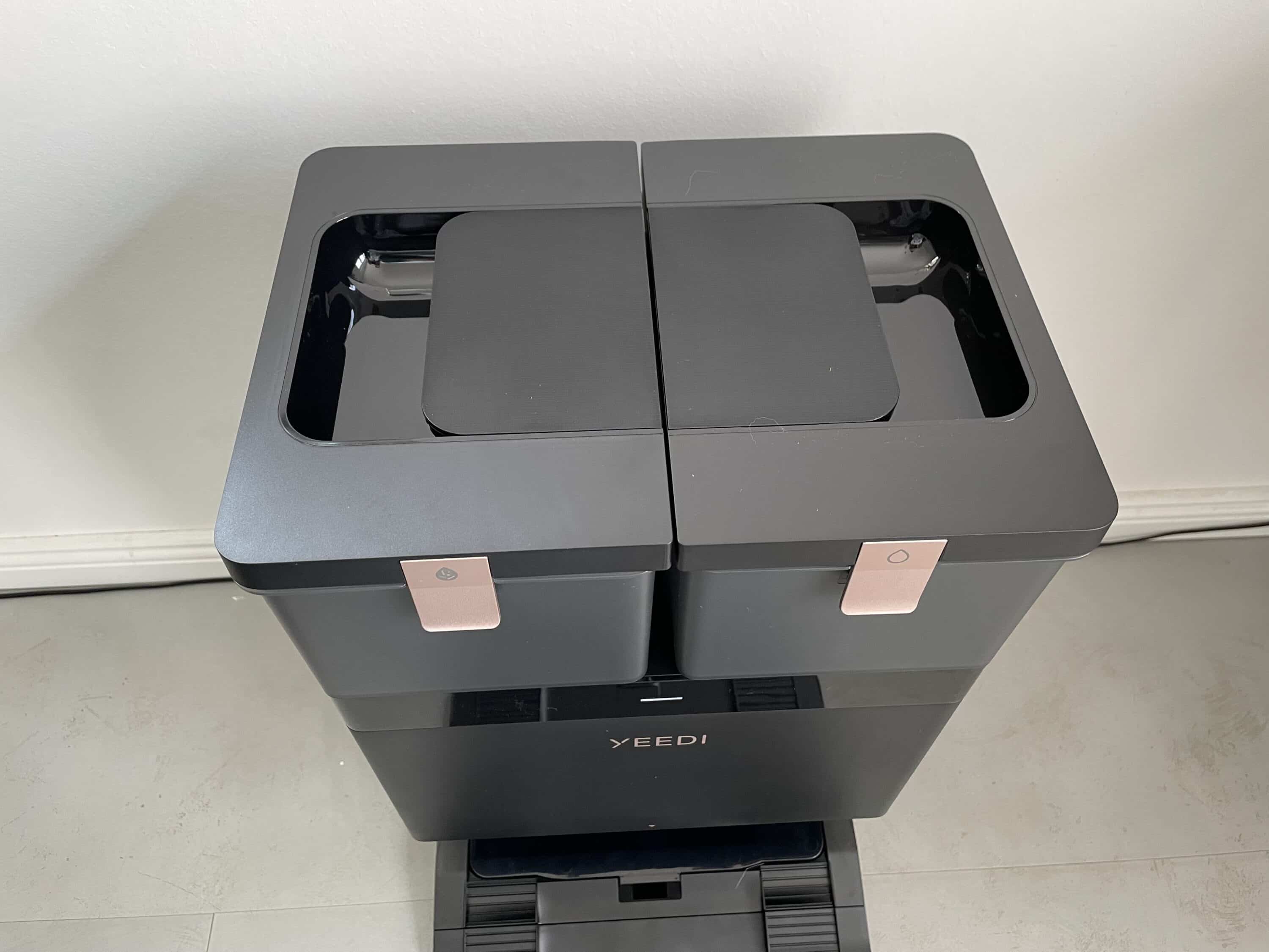 Doch abseits des Formfaktors hat die All-in-One-Station des YEEDI S14 PLUS in so ziemlich jeder Hinsicht die Nase vorne – Aus meiner Sicht auch optisch. Die Station ist in den gleichen markanten Farben wie der Roboter gehalten. Im Inneren findet ihr zwei separate Tanks – einen für Frischwasser und einen für Schmutzwasser. Beide bieten ein beachtliches Volumen von 4 Litern. Zum Vergleich: Beim Cube sind es 1 Liter bzw. 1,2 Liter.