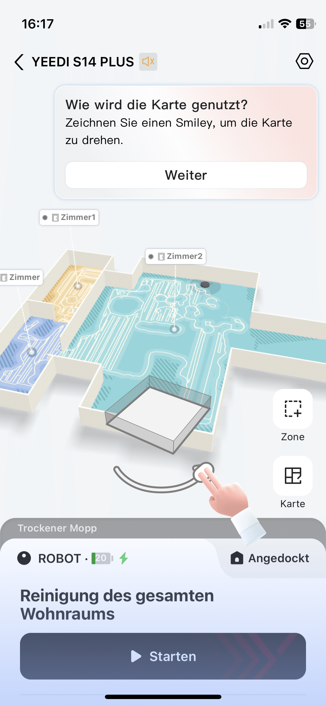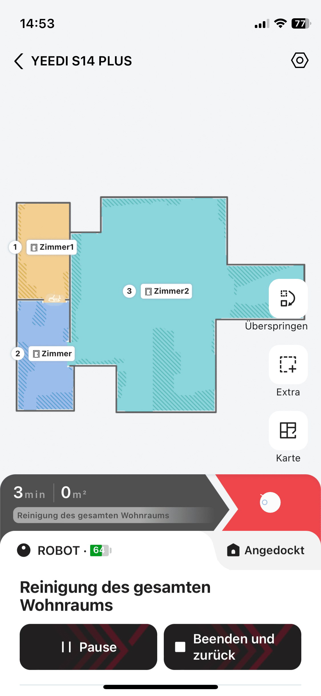 Im Anschluss könnt ihr euch das Endergebnis in der App ansehen. Sollte dieses von der Realität abweichen, lassen sich in der Karte noch einmal Anpassungen vornehmen. Jetzt noch den Frischwassertank mit Wasser füllen und der YEEDI S14 PLUS kann loslegen. Die erste Reinigungstour könnt ihr wahlweise über die App oder aber über einen Knopfdruck auf dem Robo selbst starten.