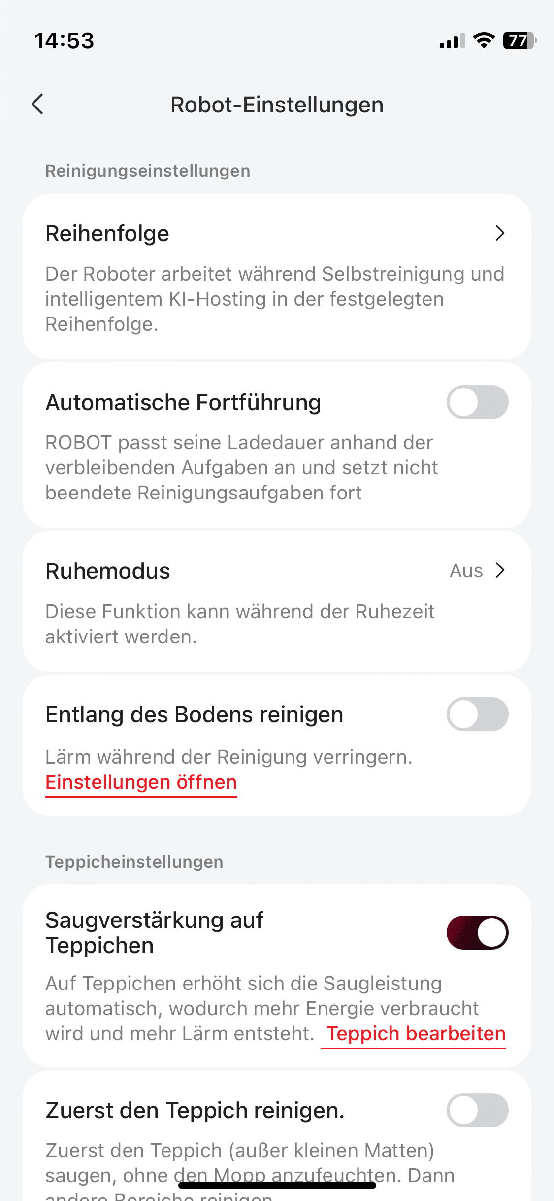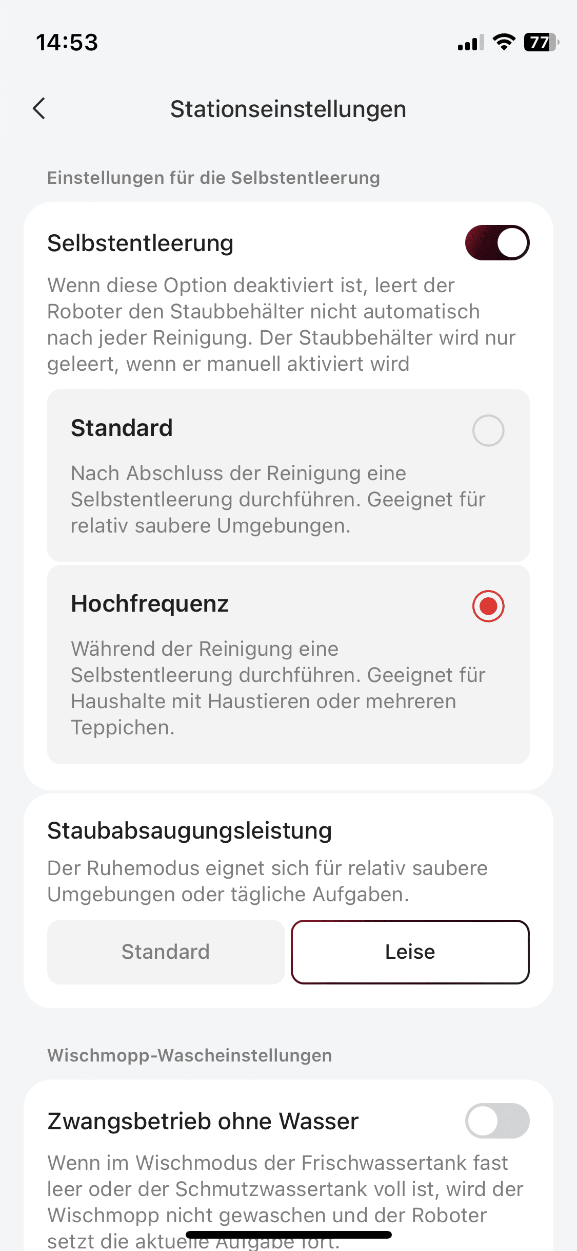 Mithilfe der App könnt ihr nicht nur den Robo ferngesteuert starten und stoppen. Obendrein könnt ihr viele verschiedene Einstellungen vornehmen. So zum Beispiel die Saugleistung. Hier habt ihr die Wahl zwischen vier verschieden starken Stufen. Um die Wischleistung zu erhöhen, könnt ihr auch die Wasserdurchflussrate erhöhen. Nicht nur der Robo, sondern auch die Station lässt sich in einigen Parametern anpassen und so zum Beispiel die Trocknungszeit der Heißlufttrocknung regulieren.