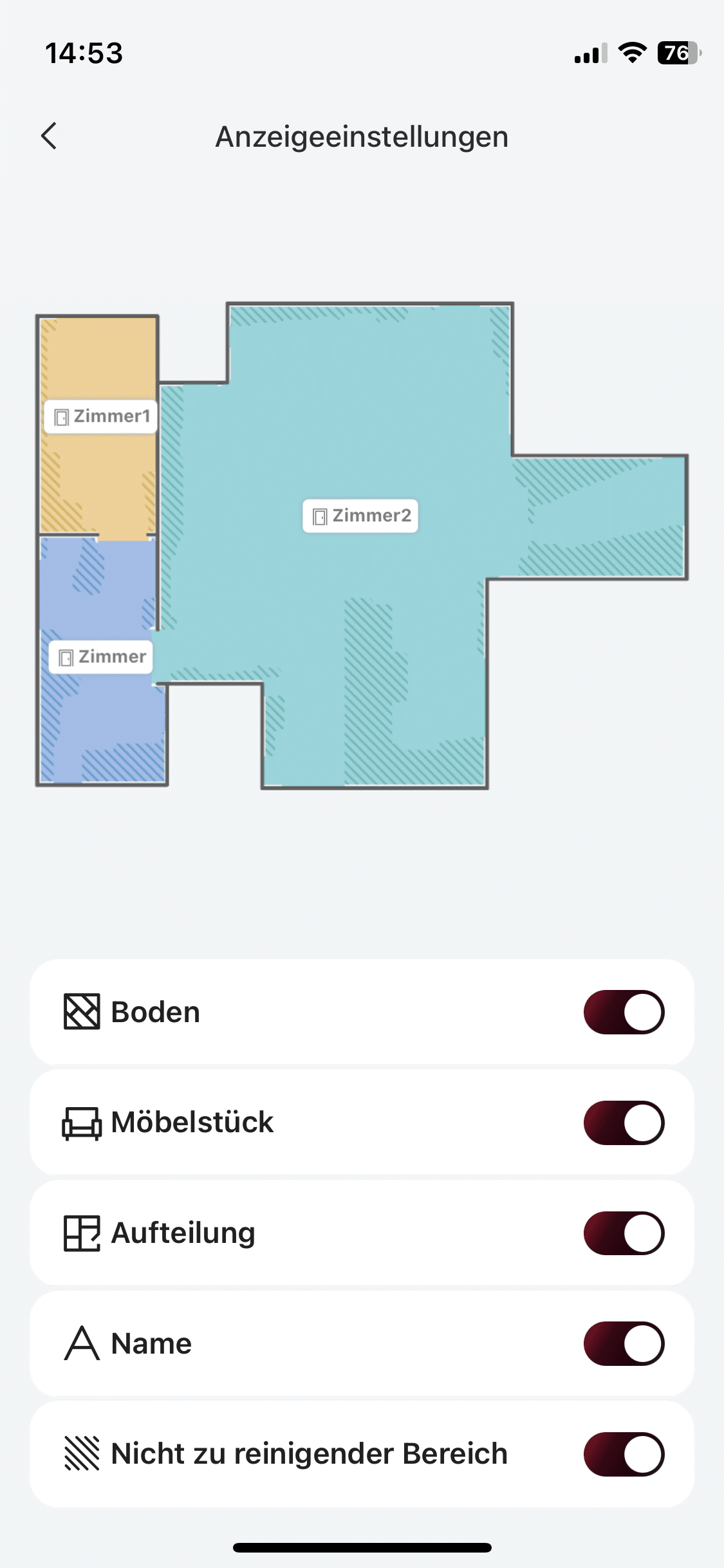 Am Ende befindet sich der S14 PLUS in eurem Netzwerk. Im Anschluss steht die Jungfernfahrt des Robos an. Hierbei erstellt das Gerät eine erste Karte deiner vier Wände. Die Ergebnisse könnt ihr in Echtzeit in der App nachvollziehen. Angesichts des fehlenden LiDAR-Turms habe ich hierbei nicht wirklich viel erwartet. Doch das Ergebnis war okay. Ihr könnt dabei zwischen einer 2D- oder auch 3D-Ansicht eurer Wohnung wählen.