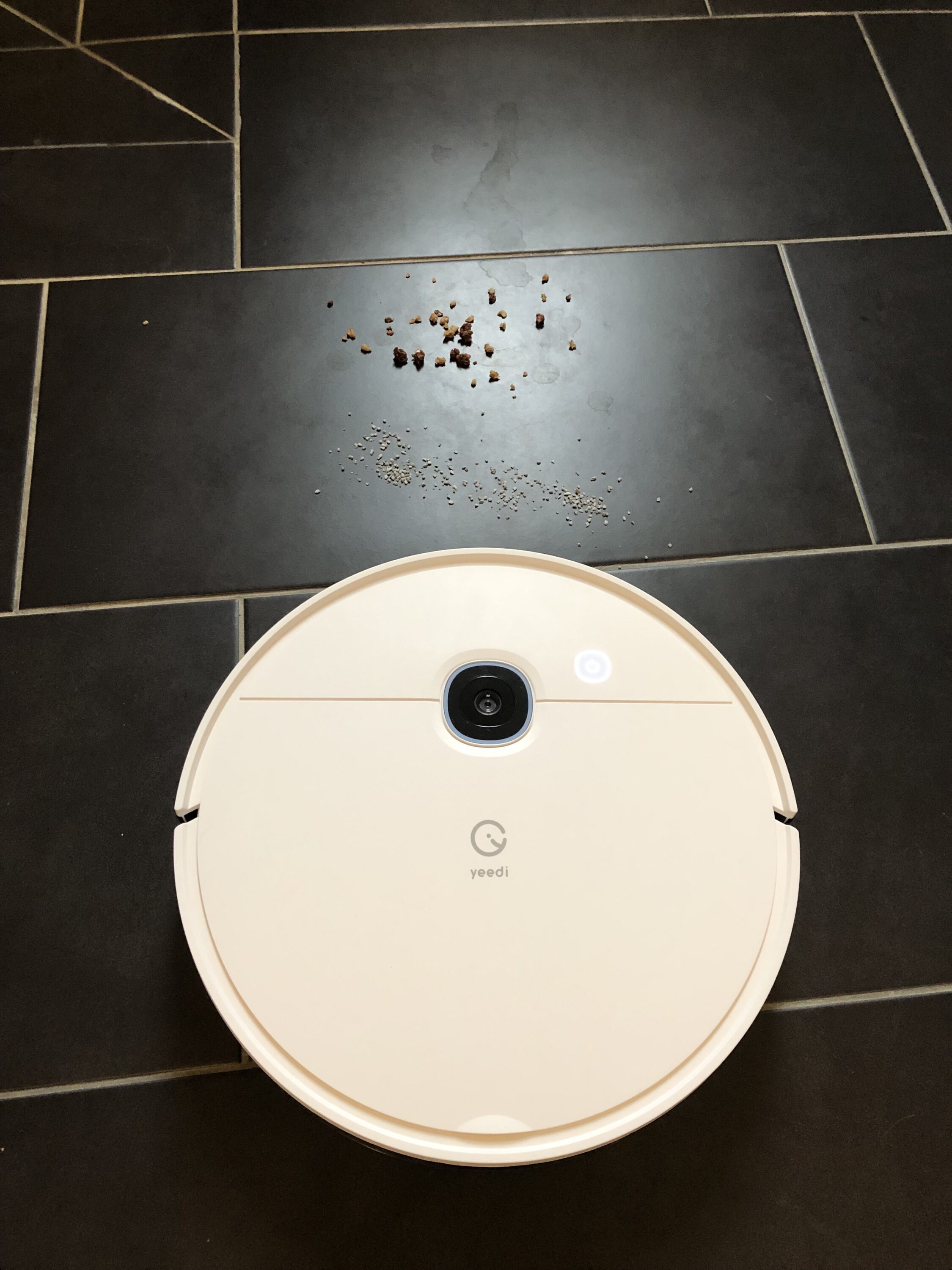 Im Test gelang dies stets problemlos. Der Vac Max musste sich keinem Hindernis geschlagen geben und fand stets die optimale Route. Dabei schont er nicht nur sich selbst, sondern auch das Mobiliar. Schließlich touchiert er, wenn überhaupt, Stühle und Tischbeine nur ganz sanft. Eine entsprechende Abfederung findet dank typischer nachgebender „Stoßstange“ gepaart mit Geschwindigkeitsreduktion statt. Hat der Yeedi dann einmal eine Komplettreinigung der Wohnung hinter sich gebracht, kann man nicht viel meckern. Dies ist wohl nicht zuletzt auf die starke Saugleistung von 3.000 Pascal zurückzuführen. Selbige war es auch, die ihn problemlos Katzenstreu und Müsli in unserem Härtetest wegsaugen ließen. Außerdem arbeitete die Teppicherkennung, welche für eine automatische Erhöhung der Saugleistung sorgt, im Test ebenfalls sehr gut.