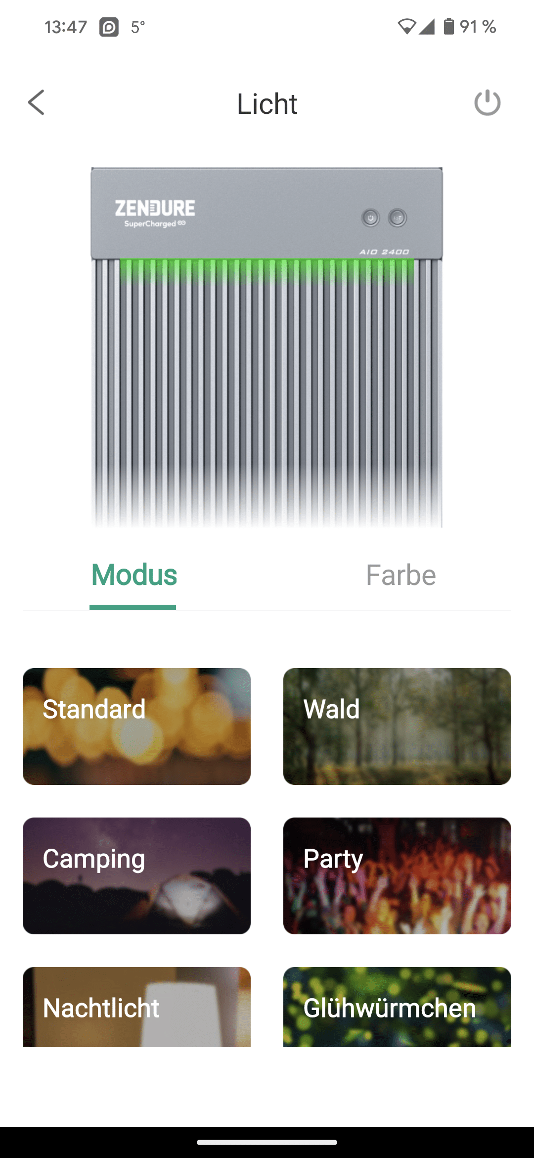 Außerdem lässt sich innerhalb der App die LED-Beleuchtung an der Vorderseite des Energiespeichers anpassen. Diese kann wahlweise in einzelnen Farben oder verschiedenen Stilen wie Wald, Party oder Glühwürmchen erstrahlen – ein schöner Design-Akzent, der das AiO-System von vielen Konkurrenten abhebt.
