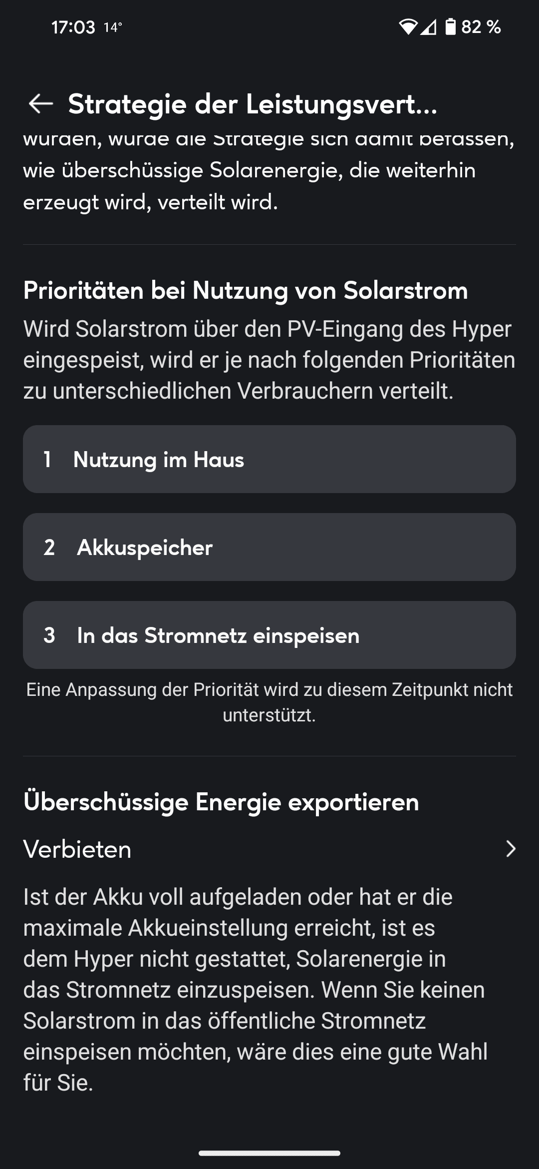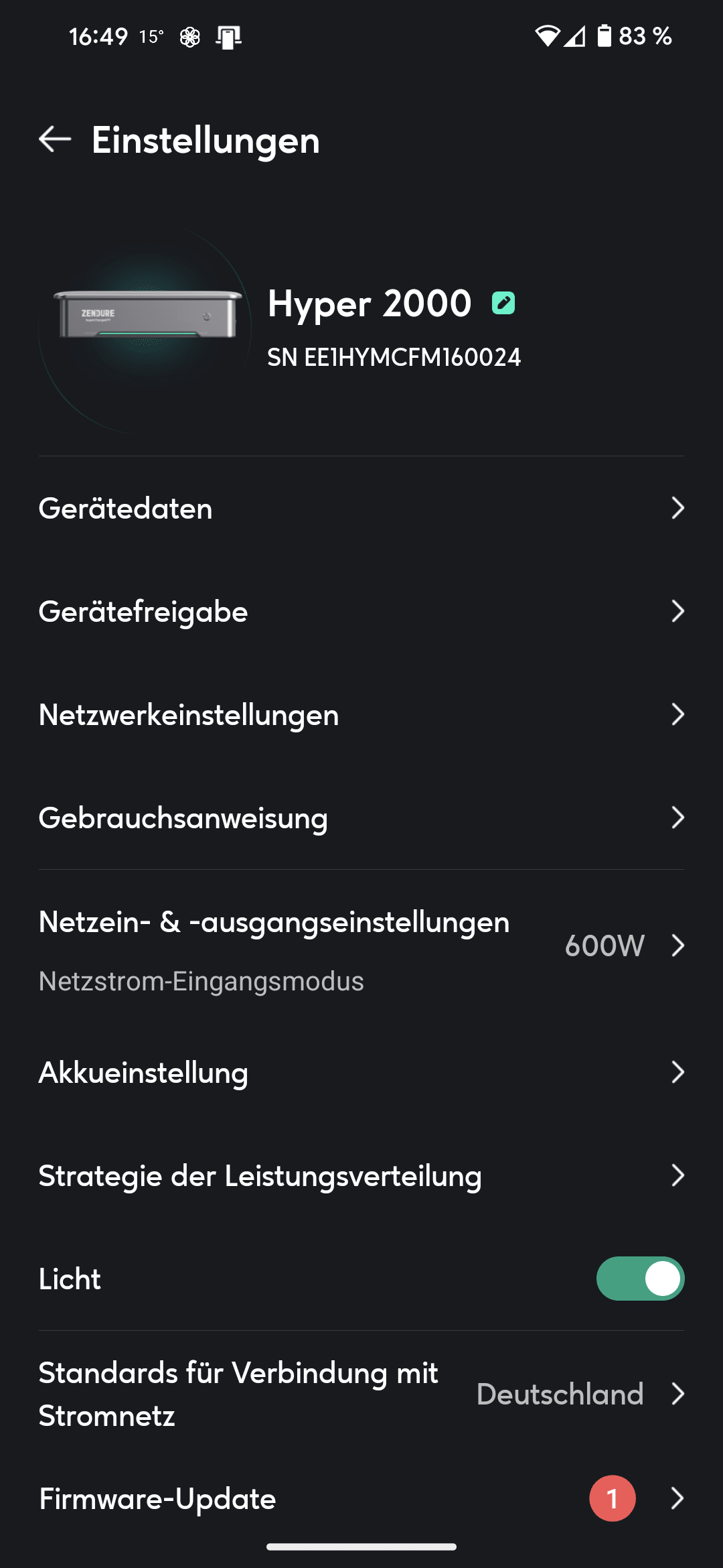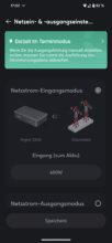 Das ist hilfreich, da du auf Grundlage dieser Werte dein PV-System optimieren kannst. In den erweiterten Optionen der App kannst du dich kräftig austoben. Hier lassen sich viele Details zur Hyper 2000 regulieren. Eine der wichtigsten ist dabei sicherlich die Regulierung von Ein- und Ausgangsleistung. So lässt sich festlegen, wie viel Watt in dein Hausnetz und wieviel in den Speicher abgegeben werden sollen.