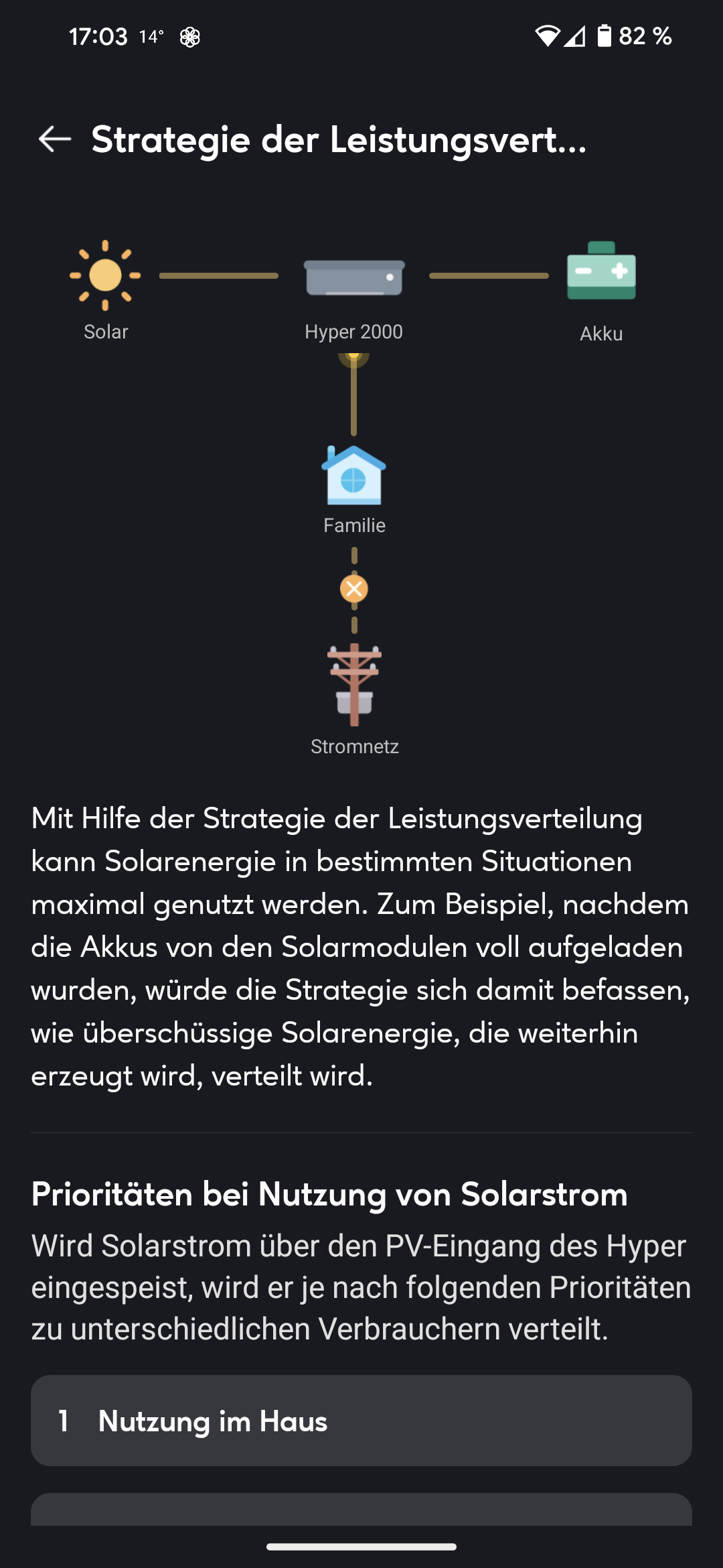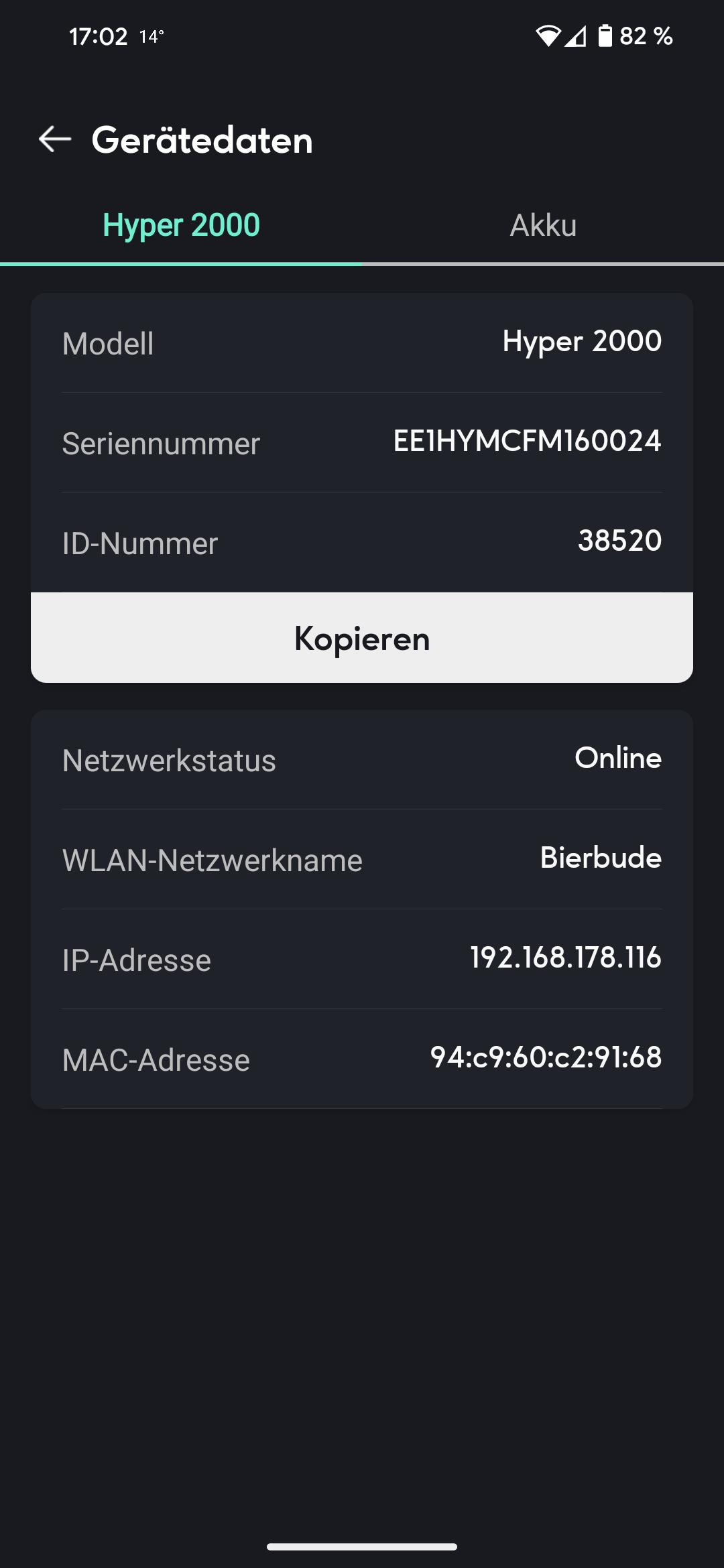 Die hauseigene App des Systems punktet mit einer tollen Übersicht. Bereits auf der Startseite kannst du auf einen Blick die wichtigsten Parameter einsehen. Dazu gehören nicht nur Lade- und Solarleistung. Auch die Menge der ins Stromnetz eingespeisten Energie kannst du ablesen. Da die Hyper 2000 auch Energie aus deiner Steckdose ziehen kann, wird obendrein der Netzbezug angezeigt.